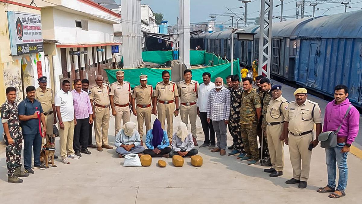 The police presenting the accused before the media, in Ongole on Monday. | Photo Credit: KOMMURI SRINIVAS The police seized 11 kg of ganja from three passengers traveling on the Ernakulam Express at Ongole Railway Station on Monday (January 5, 2026). The police stated that two of the accused are from Tamil Nadu and one from Kerala. According to the police, extensive inspections were being conducted in several express trains at Ongole Railway Station with an aim to eradicate marijuana and drugs, under the supervision of Prakasam District Superintendent of Police V. Harshavardhan Raju. Women Police Station CI Sudhakar and SIs, Special Party, EAGLE Team, Government Railway Police (GRP) and Railway Protection Force (RPF) personnel participated in these inspection. With the help of the police sniffer dog ‘Roxy’, suspicious parcels, passengers’ bags and several other items in the express train coaches, platforms, and parcel centres in the railway station were thoroughly inspected by the police teams. During inspection of train No. 18189 – Ernakulam Express going towards Kavali, the police seized around 11 kg of ganja from three passengers. They were arrested and handed over to the GRP police for further investigation.. The arrested persons were identified as G. Sandil Kumar (50 year) and B. Murugan (28 year), both from Tiruppur in Tamil Nadu, while Blessin (20 year) from Katteppana village of Idukki district in Kerala State. The police officials have warned that legal action will be taken against people transporting, selling, or using ganja or other intoxicants. They have asked the people to share any information about ganja and drugs by calling toll-free number 1972, dial 112 or on Whatsapp number 9121102266. Published – January 05, 2026 08:14 pm IST Share this: Click to share on WhatsApp (Opens in new window) WhatsApp Click to share on Facebook (Opens in new window) Facebook Click to share on Threads (Opens in new window) Threads Click to share on X (Opens in new window) X Click to share on Telegram (Opens in new window) Telegram Click to share on LinkedIn (Opens in new window) LinkedIn Click to share on Pinterest (Opens in new window) Pinterest Click to email a link to a friend (Opens in new window) Email More Click to print (Opens in new window) Print Click to share on Reddit (Opens in new window) Reddit Click to share on Tumblr (Opens in new window) Tumblr Click to share on Pocket (Opens in new window) Pocket Click to share on Mastodon (Opens in new window) Mastodon Click to share on Nextdoor (Opens in new window) Nextdoor Click to share on Bluesky (Opens in new window) Bluesky Like this:Like Loading... Post navigation Fast-track hearing in honour killing case welcomed No eligible Indian should be left out of electoral rolls: Gyanesh Kumar