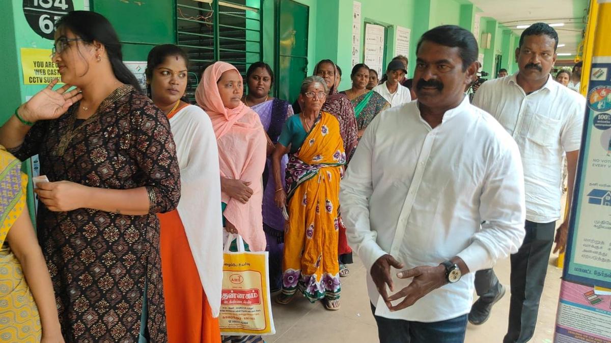NTK leader Seeman visit a polling station in Karaikudi in Sivaganga district on Thursday.
