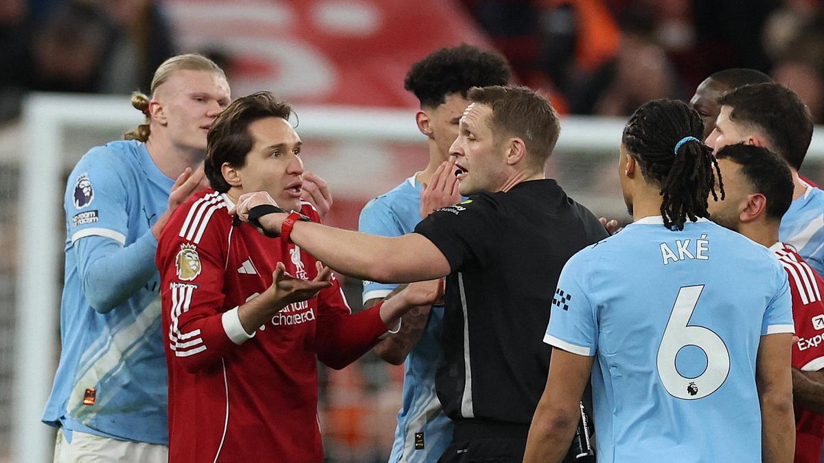 Liverpool’s Federico Chiesa remonstrates with referee Craig Pawson after he sends off Dominik Szoboszlai upon VAR review as Manchester City's Erling Haaland looks on during the Premier League football match on February 8, 2026.