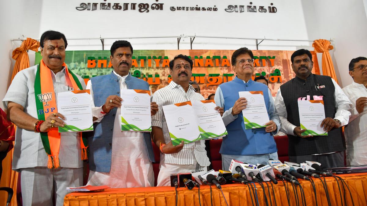 Union Minister for Commerce and Industry Piyush Goyal, BJP Tamil Nadu president Nainar Nagenthran, and other senior leaders releasing a ‘White Paper’ on the State government’s financial crisis in Chennai on Saturday. | Photo Credit: SPECIAL ARRANGEMENT Prime Minister Narendra Modi on Saturday held a meeting with senior leaders of the BJP in the State at a private hotel in Chennai regarding the upcoming Assembly election in Tamil Nadu. According to party sources, Mr. Modi held the meeting with senior leaders, including Union Minister for Commerce and Industry and BJP’s election in-charge for Tamil Nadu Piyush Goyal, Union Minister of State for Information and Broadcasting L. Murugan, State president Nainar Nagenthran, and former State presidents Pon. Radhakrishnan, Tamilisai Soundararajan, and K. Annamalai. The meeting lasted nearly 45 minutes, in which BJP’s national in charge and co-in charge for Tamil Nadu Arvind Menon and P. Sudhakar Reddy respectively, and the party’s women’s wing national president Vanathi Srinivasan, were also present, said party sources. The leaders apprised Mr. Modi regarding the ongoing election-related work in the State, party sources said. Later, at Kamalalayam, the State headquarters of the BJP, Mr. Goyal released a ‘White Paper’ on the Tamil Nadu government’s financial crisis, prepared by the State BJP’s Professional Cell. “Tamil Nadu’s treasury is empty. The outstanding debt is at its historic high at over ₹10 lakh crore. The Public Sector Undertakings under the State government have over ₹2 lakh crore of debt. The Chief Minister has no answers. He is trying to divert the attention of Tamil Nadu through fake narratives but not telling us where the money has gone. Tamil Nadu today runs like an ATM of [Mr.] Stalin’s family,” Mr. Goyal told journalists. “Tamil Nadu is heading towards bankruptcy under the corrupt DMK government. The debt has almost doubled in the last five years. The DMK government has borrowed huge amounts of money. They are required to pay ₹76,000 crore only as interest in the current year. When they pay salaries and interest, there is nothing left for the development and future of Tamil Nadu,” Mr. Goyal added. Meanwhile, Mr. Modi also met music composer Ramesh Vinayakam in Chennai. In a post on X, Mr. Modi said, “Ramesh Ji has devoted his life to popularising Indian music. He gave me a glimpse of his work in making the Gamaka Box Notation System. This is an innovative way to take Indian music to the world.” Published – April 04, 2026 06:26 pm IST Share this: Click to share on WhatsApp (Opens in new window) WhatsApp Click to share on Facebook (Opens in new window) Facebook Click to share on Threads (Opens in new window) Threads Click to share on X (Opens in new window) X Click to share on Telegram (Opens in new window) Telegram Click to share on LinkedIn (Opens in new window) LinkedIn Click to share on Pinterest (Opens in new window) Pinterest Click to email a link to a friend (Opens in new window) Email More Click to print (Opens in new window) Print Click to share on Reddit (Opens in new window) Reddit Click to share on Tumblr (Opens in new window) Tumblr Click to share on Pocket (Opens in new window) Pocket Click to share on Mastodon (Opens in new window) Mastodon Click to share on Nextdoor (Opens in new window) Nextdoor Click to share on Bluesky (Opens in new window) Bluesky Like this:Like Loading... Post navigation APCRDA initiates process to rope in consultant to develop governance framework for Amaravati Follower-turned-whistleblower of arrested Nashik godman reveals shocking details
