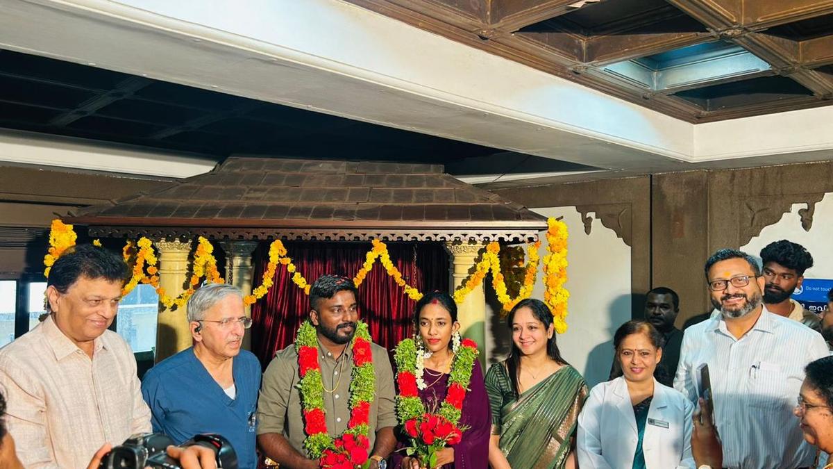 Diya G. Prahlad and Jithin Jayan during their wedding ceremony at a private hospital in kochi on Thursday. After an interval of four months, a private hospital in Kochi witnessed yet another wedding ceremony when 26-year-old Diya G. Prahlad, who was undergoing treatment following a gastro-related surgery, tied the knot with Jithin Jayan at VPS Lakeshore Hospital on Thursday (April 2, 2026). The wedding took place between 10.30 and 11 a.m. at the temple inside the hospital. The wedding had been planned months in advance. However, a few days ago, Ms. Diya was admitted to the hospital after experiencing stomach pain and required emergency surgery. As the preparations had already been completed, the family decided to go ahead with the ceremony. Since her condition did not allow her to travel, the wedding was held in the hospital, a communication said. Meanwhile, relatives and friends celebrated the occasion by holding the wedding reception at the Devikulangara Auditorium in Kayamkulam. It was last November that the hospital witnessed a similar event, when Sharon married Avani, a native of Alappuzha, who had met with an accident on her wedding day. The ceremony was held at the emergency department in the hospital. Along with close family and friends, the hospital management, doctors, and nurses also joined the occasion and stood by Ms. Diya and Mr. Jithin during the ceremony, the communication said. “Even in such a situation, things went smoothly,” Mr. Jithin said, adding that they received everyone’s love, consideration, and prayers, the hospital said in its communication. Published – April 02, 2026 11:51 pm IST Share this: Click to share on WhatsApp (Opens in new window) WhatsApp Click to share on Facebook (Opens in new window) Facebook Click to share on Threads (Opens in new window) Threads Click to share on X (Opens in new window) X Click to share on Telegram (Opens in new window) Telegram Click to share on LinkedIn (Opens in new window) LinkedIn Click to share on Pinterest (Opens in new window) Pinterest Click to email a link to a friend (Opens in new window) Email More Click to print (Opens in new window) Print Click to share on Reddit (Opens in new window) Reddit Click to share on Tumblr (Opens in new window) Tumblr Click to share on Pocket (Opens in new window) Pocket Click to share on Mastodon (Opens in new window) Mastodon Click to share on Nextdoor (Opens in new window) Nextdoor Click to share on Bluesky (Opens in new window) Bluesky Like this:Like Loading... Post navigation IPL 2026: Rizvi grabs the opportunity to bat at No. 4 HC directs GRH Dean to order post-mortem on man’s body by two doctors