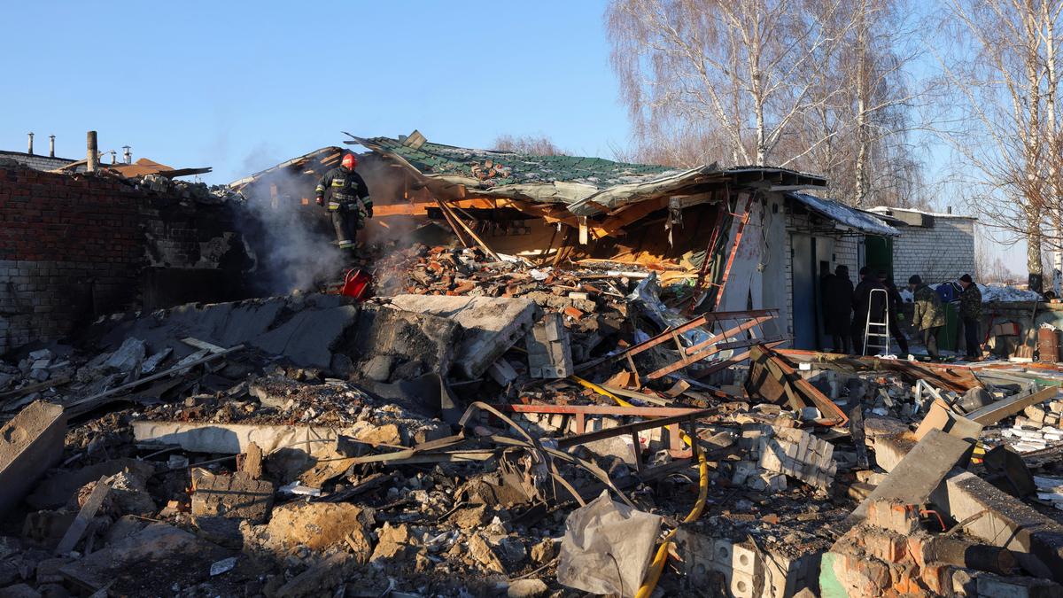 A firefighter works at the site of car garages hit by a Russian missile strike, amid Russia’s attack on Ukraine, in Chernihiv, Ukraine, on January 5, 2026.