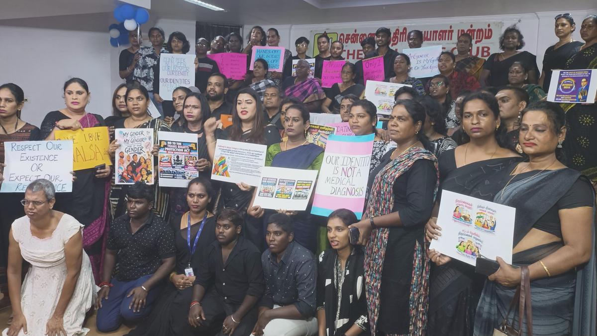 Members of the Trans Bill Protest Committee of Tamil Nadu protesting against the Bill at Chennai Press Club on Tuesday. | Photo Credit: R. RAGU The Trans Bill Protest Committee of Tamil Nadu on Tuesday demanded the immediate withdrawal of Transgender Persons (Protection of Rights) Amendment Bill and ensure the protection of the constitutional right to self-identification of gender identity. Addressing mediapersons in Chennai, the committee said, “The amendment violates the fundamental rights guaranteed under the Indian Constitution and contradicts the Supreme Court judgment NALSA vs Union of India (2014), as well as internationally recognised healthcare standards.” Published – March 18, 2026 04:51 am IST Share this: Click to share on WhatsApp (Opens in new window) WhatsApp Click to share on Facebook (Opens in new window) Facebook Click to share on Threads (Opens in new window) Threads Click to share on X (Opens in new window) X Click to share on Telegram (Opens in new window) Telegram Click to share on LinkedIn (Opens in new window) LinkedIn Click to share on Pinterest (Opens in new window) Pinterest Click to email a link to a friend (Opens in new window) Email More Click to print (Opens in new window) Print Click to share on Reddit (Opens in new window) Reddit Click to share on Tumblr (Opens in new window) Tumblr Click to share on Pocket (Opens in new window) Pocket Click to share on Mastodon (Opens in new window) Mastodon Click to share on Nextdoor (Opens in new window) Nextdoor Click to share on Bluesky (Opens in new window) Bluesky Like this:Like Loading... Post navigation U.N. says more than 36,000 Palestinians displaced by Israeli settlement drive Metro Rail to begin study to improve walkability near 41 stations of phase I network