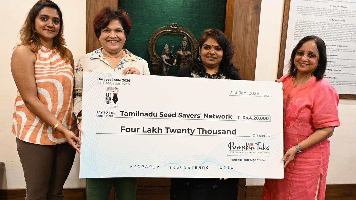 Chindi Varadarajulu, creative chef and founder, Pumpkin Tales, and Nirmala Lakshman, Chairperson of The Hindu, presenting a cheque to Akila Kunala of the Tamil Nadu Seed Savers Network at The Hindu office on Monday. | Photo Credit: RAGU R In January this year, Chennai’s Pumpkin Tales hosted a harvest table led by Canadian chef Jeff Van Geest, in association with The Hindu’s Lit for Life, the annual literary festival of the publication. The 14th edition of the festival saw a registration of over 12,000 for both days of the programme. . At the Harvest Table, a six-course contemporary Italian meal was made with produce sourced from local farmers. All proceeds from the meal were to be donated to the Tamil Nadu Seed Savers Network, a farmer-led initiative that works on conserving, protecting and distributing indigenous and climate-resilient seeds. Published – March 03, 2026 05:30 am IST Share this: Click to share on WhatsApp (Opens in new window) WhatsApp Click to share on Facebook (Opens in new window) Facebook Click to share on Threads (Opens in new window) Threads Click to share on X (Opens in new window) X Click to share on Telegram (Opens in new window) Telegram Click to share on LinkedIn (Opens in new window) LinkedIn Click to share on Pinterest (Opens in new window) Pinterest Click to email a link to a friend (Opens in new window) Email More Click to print (Opens in new window) Print Click to share on Reddit (Opens in new window) Reddit Click to share on Tumblr (Opens in new window) Tumblr Click to share on Pocket (Opens in new window) Pocket Click to share on Mastodon (Opens in new window) Mastodon Click to share on Nextdoor (Opens in new window) Nextdoor Click to share on Bluesky (Opens in new window) Bluesky Like this:Like Loading... Post navigation Chennai Metro Rail’s average daily ridership jumps to 3.44 lakh in February Cuddalore’s Silver Beach, developed under Blue Flag certification programme, ready for inauguration