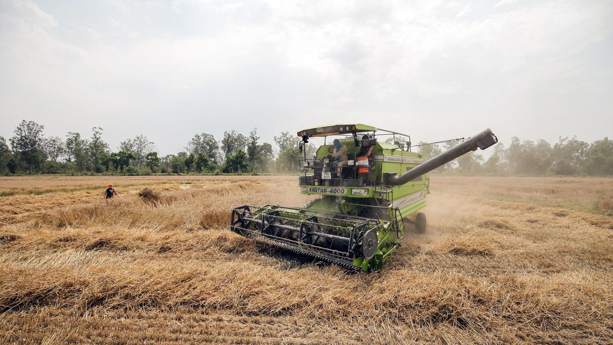 Farmers harvest wheat crop in a field at a village near Amritsar on April 17, 2026.