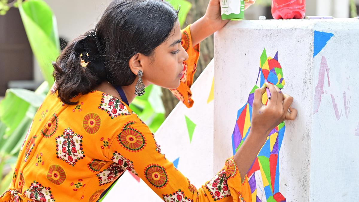 A girl painting an artistic representation of Schrödinger’s cat that reminds of Erwin Schrödinger’s experiment that brought attention to quantum science, as part of the Quantum Century exhibition at Government College for Women in Thiruvananthapuram on Wednesday.