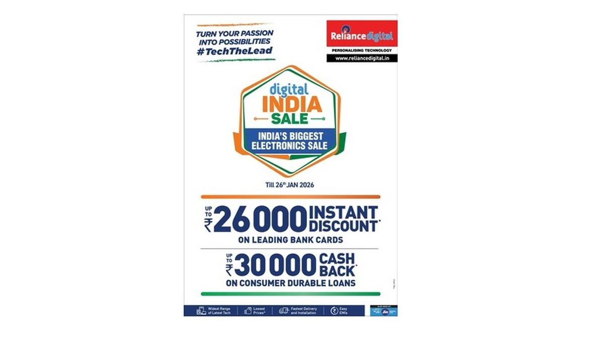 Reliance Digital Announces ‘Digital India Sale’ from 17th to 26th Jan: Offers on Apple, Exclusive Republic Day Deals, & Massive Savings on Electronics Those Planning to Buy Electronics this Republic Day Should Not Miss the Digital India Sale by Reliance Digital – iPhone Deals Starting at ₹49,990. Interested Customers can Visit their Nearest Store or Shop Online Today MUMBAI, India, Jan. 15, 2026 /PRNewswire/ — Celebrating the spirit of Republic Day, India’s leading electronics retailer invites shoppers to upgrade their homes and lifestyles during the Digital India Sale, from 17th to 26th January 2026, with the latest technology. Maximise savings with up to ₹26,000 instant bank discount or get up to ₹30,000 cashback on consumer durable loans – making every upgrade easier and more affordable. From HD TVs to smart appliances, Digital India Sale offers bring something for everyone. Owning an iPhone is easier than ever with never-before seen price slashes on popular iPhone models – up to ₹12,000 discount on MRP with additional bank discounts. Blockbuster deals include the iPhone 15 128GB starting from just ₹49,990 with EMIs of ₹2,888; iPhone 16 128GB starting from ₹57,990 with EMIs of ₹3,388; and iPhone 17 256GB starting from ₹78,900 with EMIs ₹3,454. Premium variants like iPhone 17 Pro 256GB start from ₹130,900 (EMIs starting from ₹11,242), ideal for power users seeking cutting-edge performance. Own the MacBook Air M2 for just ₹64,990*/- Includes ₹4,000 cashback plus FREE Microsoft Office worth ₹6,899. Elevate productivity with this unbeatable offer today! Get Toshiba 58” QLED TV at ₹35,990 with 2 years warranty. Planning a kitchen upgrade? Buy Small Domestic Appliances worth ₹5000 or more and get assured freebies worth up to ₹7990, in addition to discounts of up to 50% on select products. Get Side by Side refrigerator starting at ₹44,990/-* & get free Havells Air fryer worth ₹7,500/-*. Double door refrigerators starting at ₹18,490/-* & get free Boat Sound bar or Phillips Dry Iron. Simplify laundry routines with smart AI all in one washer and dryer. Buy 10 Kg AI front load washing machine starting at ₹37,490/-* and get assured gifts worth ₹5000/-* These exclusive offers blend instant savings, bank cashback, and exchange benefits, making tech upgrades easier during the Digital India Sale. *Terms and Conditions apply Website: https://www.reliancedigital.in/ “This is a company press release that is not part of editorial content. No journalist of The Hindu was involved in the publication of this release.” Published – January 16, 2026 03:21 pm IST Share this: Click to share on WhatsApp (Opens in new window) WhatsApp Click to share on Facebook (Opens in new window) Facebook Click to share on Threads (Opens in new window) Threads Click to share on X (Opens in new window) X Click to share on Telegram (Opens in new window) Telegram Click to share on LinkedIn (Opens in new window) LinkedIn Click to share on Pinterest (Opens in new window) Pinterest Click to email a link to a friend (Opens in new window) Email More Click to print (Opens in new window) Print Click to share on Reddit (Opens in new window) Reddit Click to share on Tumblr (Opens in new window) Tumblr Click to share on Pocket (Opens in new window) Pocket Click to share on Mastodon (Opens in new window) Mastodon Click to share on Nextdoor (Opens in new window) Nextdoor Click to share on Bluesky (Opens in new window) Bluesky Like this:Like Loading... Post navigation MSP guarantee law: Farmers’ awareness yatra from Kanyakumari to Kashmir from Feb 7 Drunk driver arrested after car hits two pedestrians in separate accidents in Miyapur