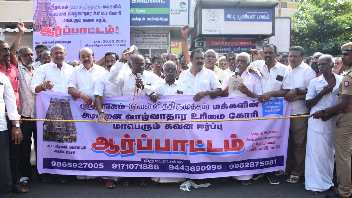 Residents staging a protest in Srirangam on Thursday. | Photo Credit: Special Arrangement Members of various political parties, cutting across party lines, staged a protest in front the Rajagopuram in Srirangam on Thursday, seeking the intervention of the State government to resolve the long-pending dispute between a section of residents owners and Sri Ranganathaswamy Temple administration with respect to ownership of property around the temple. V. Jawahar, councillor of the Tiruchi Corporation representing Ward No. 2, presided over the protest. R. Manoharan, former MLA, Diamond Tirupati, Srirangam zone secretary (AIADMK), Ramkumar, Srirangam zone secretary (DMK), and members of the Congress, the MDMK, the Communist Part of India, and the Community Party of India (Marxist) participated in the protest. Published – February 26, 2026 06:37 pm IST Share this: Click to share on WhatsApp (Opens in new window) WhatsApp Click to share on Facebook (Opens in new window) Facebook Click to share on Threads (Opens in new window) Threads Click to share on X (Opens in new window) X Click to share on Telegram (Opens in new window) Telegram Click to share on LinkedIn (Opens in new window) LinkedIn Click to share on Pinterest (Opens in new window) Pinterest Click to email a link to a friend (Opens in new window) Email More Click to print (Opens in new window) Print Click to share on Reddit (Opens in new window) Reddit Click to share on Tumblr (Opens in new window) Tumblr Click to share on Pocket (Opens in new window) Pocket Click to share on Mastodon (Opens in new window) Mastodon Click to share on Nextdoor (Opens in new window) Nextdoor Click to share on Bluesky (Opens in new window) Bluesky Like this:Like Loading... Post navigation Water level in Mullaperiyar dam stands at 117.10 feet Set rules to cancel permits of private schools if fees exceed norms: Telangana CM