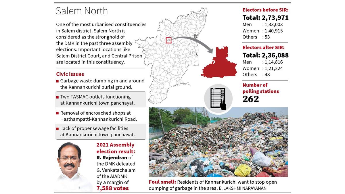 Salem North, an urbanised constituency in Salem district that is represented by Tourism Minister R. Rajendran, was created in 2008 after delimitation, including 22 wards of Salem Corporation (wards 6 to 16, 26 to 36) and the Kannankurichi town panchayat. Mr. Rajendran won in 2016 and 2021 and the constituency is considered a DMK stronghold in the district. Out of three elections (after the formation of the constituency in 2008), the DMK won twice, and the DMDK won in 2011 while in the AIADMK alliance. After September 2024, most of the roads dug for various works were newly relaid by the Corporation. Likewise, the wards that lacked sewage channels and stormwater drainage were provided with those facilities in the last one-and-a-half years. There is no major complaint by residents regarding road or sewage channels. Likewise, there are no drinking water supply issues in this constituency. At the Kannankurichi town panchayat, most of the lands have been developed into housing plots in the last 15 years and people are willing to buy lands in this panchayat as it is situated near the foothills of Yercaud. A. Subramani, a resident of Kannankurichi, said that in the last 15 years, the number of people moving to Kannankurichi has increased. However, many areas still lack proper sewage channels. The garbage generated is dumped in and around the Kannankurichi burial ground that has a temple and an upgraded primary health centre (PHC) nearby. Due to the dumping of waste, people visiting the PHC and the temple are unable to bear the foul smell. Residents of Kannankurichi noted two TASMAC outlets functioning at the centre of the panchayat, with a government school, Kannankurichi police station, and Kannankurichi bus stand located close-by. People visiting the outlets consume liquor near the main road and during the evening, people are unable to pass the road due to the crowd at the TASMAC outlet. The residents have made several representations demanding to shift the outlets. Residents added that one outlet has been functioning for the past eight years and another one for the past six years, and demanded that the two outlets be shifted. V. Madhu, a resident of Ponnammapet, said that due to the presence of two railway gates at Ponnammapet, the gates are closed four to five times per day. More than 30 buses have to pass this road. The government has already announced a flyover at Ponnammapet. But the work is yet to begin, he added. The knowledge centre at Ayyanthirumalai, ongoing construction for Bharathidasan Arivulagam at ₹103.90 crore and other successful implementations of various government schemes will provide victory for the DMK, party functionaries said. Salem North constituency is given to the PMK under the AIADMK alliance. The PMK cadre claimed that the AIADMK government’s achievements in the past and the freebie announcements for 2026 Assembly elections will favour their victory. The NTK and TVK also believe the first-time voters and youth will ensure their victory. Published – March 26, 2026 11:17 pm IST Share this: Click to share on WhatsApp (Opens in new window) WhatsApp Click to share on Facebook (Opens in new window) Facebook Click to share on Threads (Opens in new window) Threads Click to share on X (Opens in new window) X Click to share on Telegram (Opens in new window) Telegram Click to share on LinkedIn (Opens in new window) LinkedIn Click to share on Pinterest (Opens in new window) Pinterest Click to email a link to a friend (Opens in new window) Email More Click to print (Opens in new window) Print Click to share on Reddit (Opens in new window) Reddit Click to share on Tumblr (Opens in new window) Tumblr Click to share on Pocket (Opens in new window) Pocket Click to share on Mastodon (Opens in new window) Mastodon Click to share on Nextdoor (Opens in new window) Nextdoor Click to share on Bluesky (Opens in new window) Bluesky Like this:Like Loading... Post navigation Indian among two killed in UAE by debris of intercepted missiles Coonoor constituency needs a sustainable development model that protects environment, ensures livelihood
