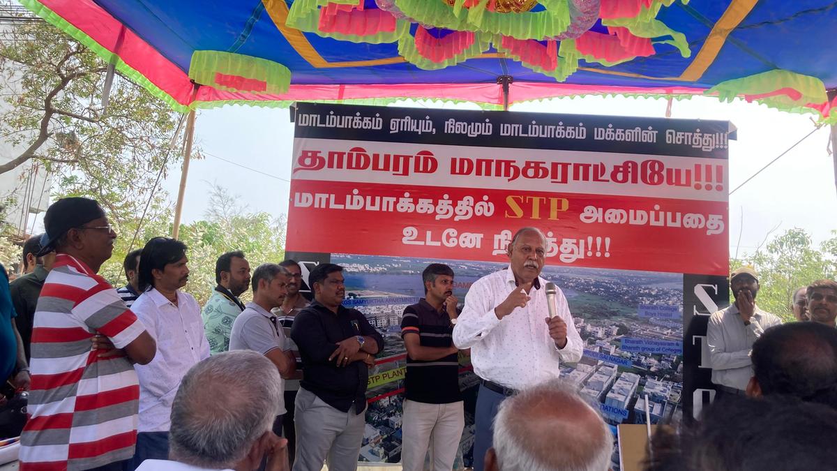 During the protest meeting. | Photo Credit: Special arrangement On March 1, close to 200 residents of Madambakkam attended a protest meeting, one furthering the goals of the Save Madambakkam Lake movement. They urged the Tambaram City Municipal Corporation to drop the plan to establish a Sewage Treatment Plant (STP) in the vicinity of Madambakkam Lake. Brigadier (retired) Mohan Thomas, a social activist, who took part in the meeting, says, “The STP should be commissioned far away from the crowded localities and not near the Madambakkam lake. A waterbody must receive fresh rainwater and not treated water.” Published – March 08, 2026 01:53 pm IST Share this: Click to share on WhatsApp (Opens in new window) WhatsApp Click to share on Facebook (Opens in new window) Facebook Click to share on Threads (Opens in new window) Threads Click to share on X (Opens in new window) X Click to share on Telegram (Opens in new window) Telegram Click to share on LinkedIn (Opens in new window) LinkedIn Click to share on Pinterest (Opens in new window) Pinterest Click to email a link to a friend (Opens in new window) Email More Click to print (Opens in new window) Print Click to share on Reddit (Opens in new window) Reddit Click to share on Tumblr (Opens in new window) Tumblr Click to share on Pocket (Opens in new window) Pocket Click to share on Mastodon (Opens in new window) Mastodon Click to share on Nextdoor (Opens in new window) Nextdoor Click to share on Bluesky (Opens in new window) Bluesky Like this:Like Loading... Post navigation Women bring valuable perspectives for ethical AI: Nasscom Chairperson Global warming picking up pace, study says