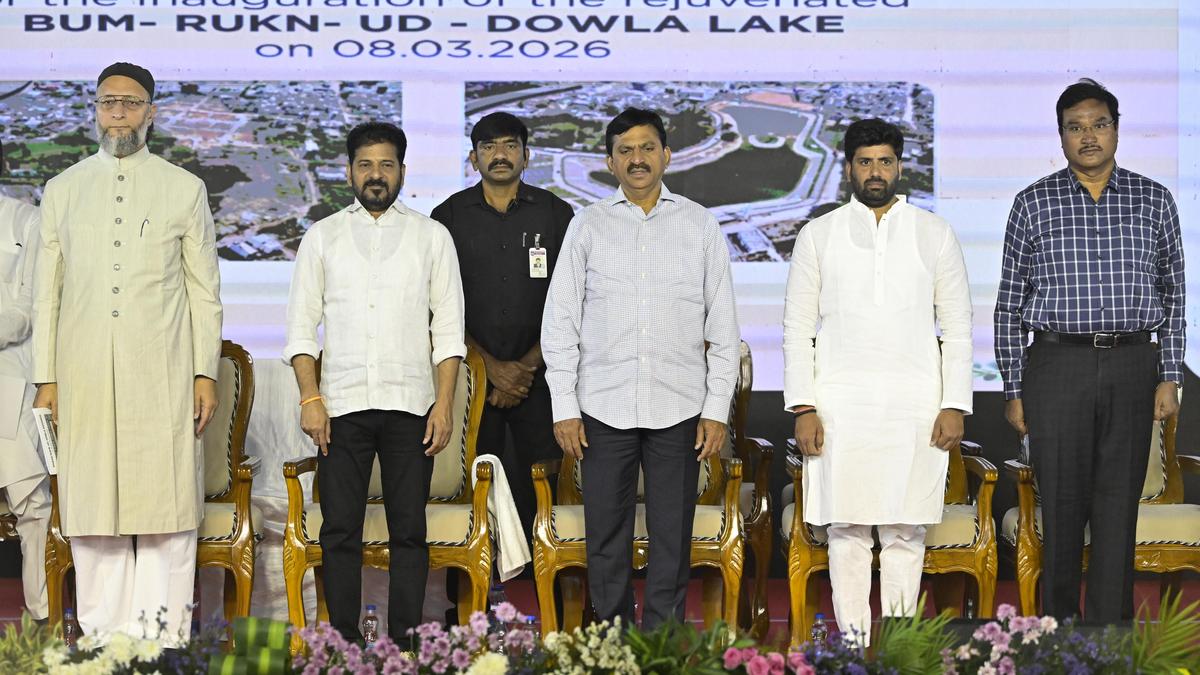 Chief Minister A. Revanth Reddy along with AIMIM party president Asaduddin Owaisi and others at the inauguration of Bam Rukn-ud-Daula Lake in Hyderabad on Sunday.