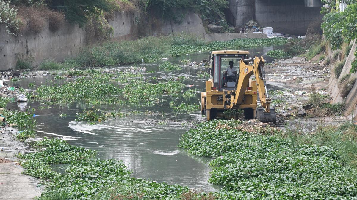 Salem Corporation carried out works to remove waste accumulated in Thirumanimutharu at Old Bus Stand in Salem city on Tuesday.