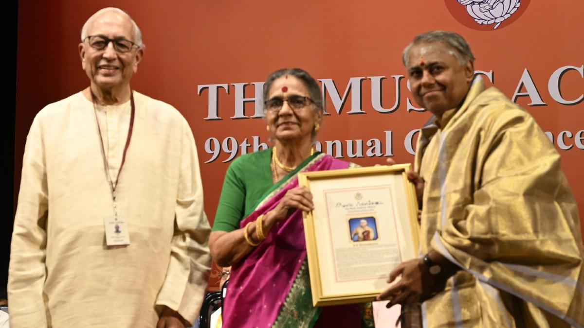 Violinist N. Rajam presenting the Sangita Kalanidhi award to R.K. Shriramkumar at the Sadas of the Music Academy on January 1, 2025. N. Murali, president of the Academy, is seen