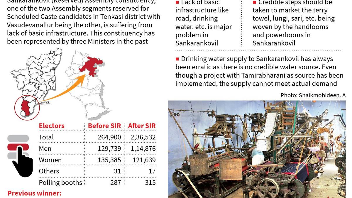 Constituency Watch – SANKARANKOVIL | Photo Credit: Rajesh R Sankarankovil (Reserve) constituency, comprising the holy town of Sankarankovil, is a segment which is waiting for decades for better roads, sufficient and good drinking water supply among other basic infrastructure facilities. Even though Sankarankovil has been represented by Ministers S. Thangavelu of DMK and C. Karuppasamy and V.M. Rajalakshmi of AIADMK, this small town is in pathetic shape even today with cramped roads, poor supply of drinking water etc. Of this, Karuppasamy won the elections in 1996, 2001, 2006 and 2011. Even when AIADMK supremo J Jayalalithaa suffered an agonizing defeat in Bargur in 1996 even as the party lost power to the DMK, Karuppasamy got elected from Sankarankovil. He repeated the same feat in 2006 also when the DMK returned to power. Published – April 08, 2026 10:08 pm IST Share this: Click to share on WhatsApp (Opens in new window) WhatsApp Click to share on Facebook (Opens in new window) Facebook Click to share on Threads (Opens in new window) Threads Click to share on X (Opens in new window) X Click to share on Telegram (Opens in new window) Telegram Click to share on LinkedIn (Opens in new window) LinkedIn Click to share on Pinterest (Opens in new window) Pinterest Click to email a link to a friend (Opens in new window) Email More Click to print (Opens in new window) Print Click to share on Reddit (Opens in new window) Reddit Click to share on Tumblr (Opens in new window) Tumblr Click to share on Pocket (Opens in new window) Pocket Click to share on Mastodon (Opens in new window) Mastodon Click to share on Nextdoor (Opens in new window) Nextdoor Click to share on Bluesky (Opens in new window) Bluesky Like this:Like Loading... Post navigation More villages but less population makes development of Tiruchuli Assembly constituency challenging Centre approves Warangal airport; Adilabad project to be taken up by Defence Ministry