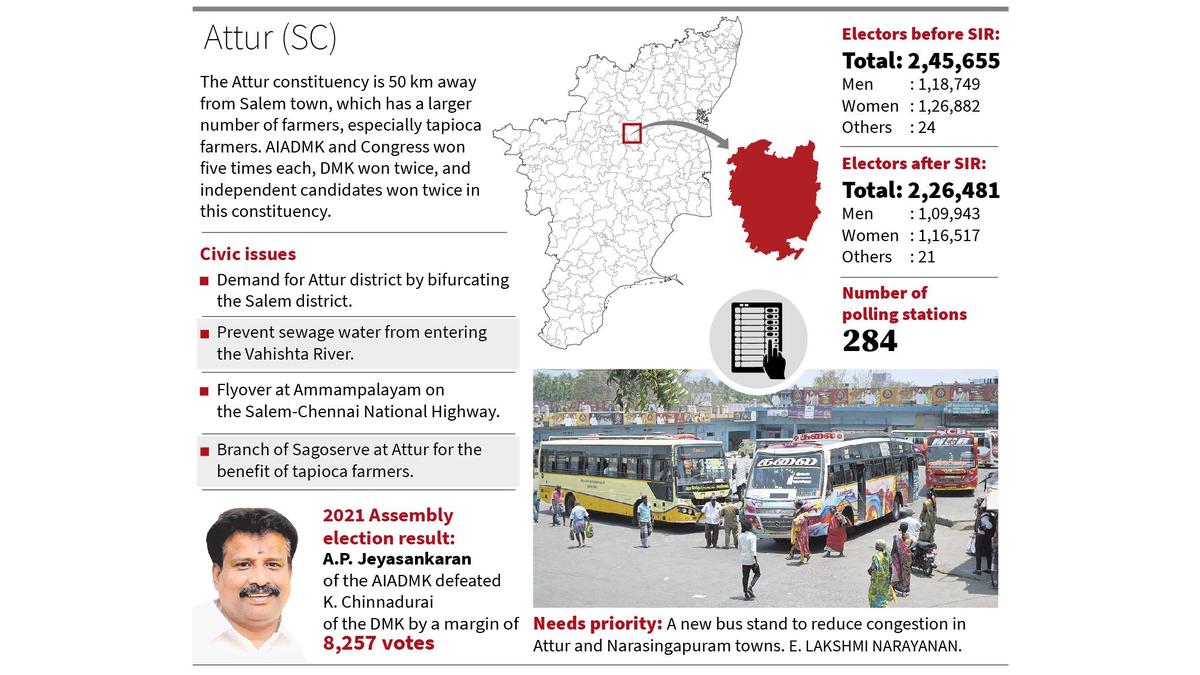 The Attur (SC) constituency, located 50 km away from Salem town, is predominantly an agricultural area for tapioca cultivation and Attur has dozens of sago factories. The constituency was represented by the AIADMK (1991, 2001, 2011, 2016, and 2021) and the Congress (1962, 1977, 1980, 1984, and 2006) five times each and by the DMK four times (1967, 1971, 1989, and 1996). S. Rajendran, a tapioca farmer, said that Attur is one of the largest tapioca-cultivating areas in Tamil Nadu. But the price fixed by the sago factories for the tapioca is not enough. Sagoserve functioning in Salem ensures the quality of sago produced and exported. A Sagoserve branch should be established in Attur, he said. A. Jayaraman, a resident of Ramanaickenpalayam, said that farmers have been demanding construction of a small dam at Ramanaickenpalayam for the last 20 years. A.K. Kanagaraj, a resident of Vellalapatti, said that residents of Vellalapatti, Ganesapuram, Neiyamalai Foothills, Kanavaikadu, and Kurichi rural areas suffer without mobile phone signals. “We have submitted multiple petitions but there is no action,” he said. Farmers have been demanding for years for water from the Puzhuthikuttai dam through a lift irrigation scheme to Vellalapatti, which will benefit over 2,000 hectares of agricultural land. The Vashishta River, which flows in Attur, was once used for drinking water purposes. But now, sewage released into it from in and around Attur is flowing, he said. P. Siva, a resident of Attur, said that for the past 10 years, people have been demanding bifurcation of Salem district to create Attur as a separate district. Political parties, including the PMK and the KMDK, raised this issue many times and in 2014, AIADMK MLA S. Madheswaran raised this demand in the Assembly. People residing in Attur and Thalaivasal travel 50 km and 70 km respectively, to reach Salem. N. Madeswaran, a resident of Attur municipality, said that drinking water supply is the main issue in the municipality as the supply is just twice or thrice a month from the Attur-Nangavalli combined drinking water scheme. A new dedicated water supply scheme is needed or the existing pipelines should be replaced and water should be supplied at regular intervals, he added. M. Saravanan, a resident of Narasingapuram, said that all the buses headed to Attur bus stand from Salem pass through the narrow roads of Narasingapuram. The Narasingapuram-Attur stretch has narrow roads in many places and traffic issues are common in the mornings and evenings. The bus stand should be shifted from Attur to the outer area to reduce the traffic. Published – March 27, 2026 07:35 pm IST Share this: Click to share on WhatsApp (Opens in new window) WhatsApp Click to share on Facebook (Opens in new window) Facebook Click to share on Threads (Opens in new window) Threads Click to share on X (Opens in new window) X Click to share on Telegram (Opens in new window) Telegram Click to share on LinkedIn (Opens in new window) LinkedIn Click to share on Pinterest (Opens in new window) Pinterest Click to email a link to a friend (Opens in new window) Email More Click to print (Opens in new window) Print Click to share on Reddit (Opens in new window) Reddit Click to share on Tumblr (Opens in new window) Tumblr Click to share on Pocket (Opens in new window) Pocket Click to share on Mastodon (Opens in new window) Mastodon Click to share on Nextdoor (Opens in new window) Nextdoor Click to share on Bluesky (Opens in new window) Bluesky Like this:Like Loading... Post navigation No need to panic on fertilizer stocks: Centre Myanmar military signals leadership changes as parade begins