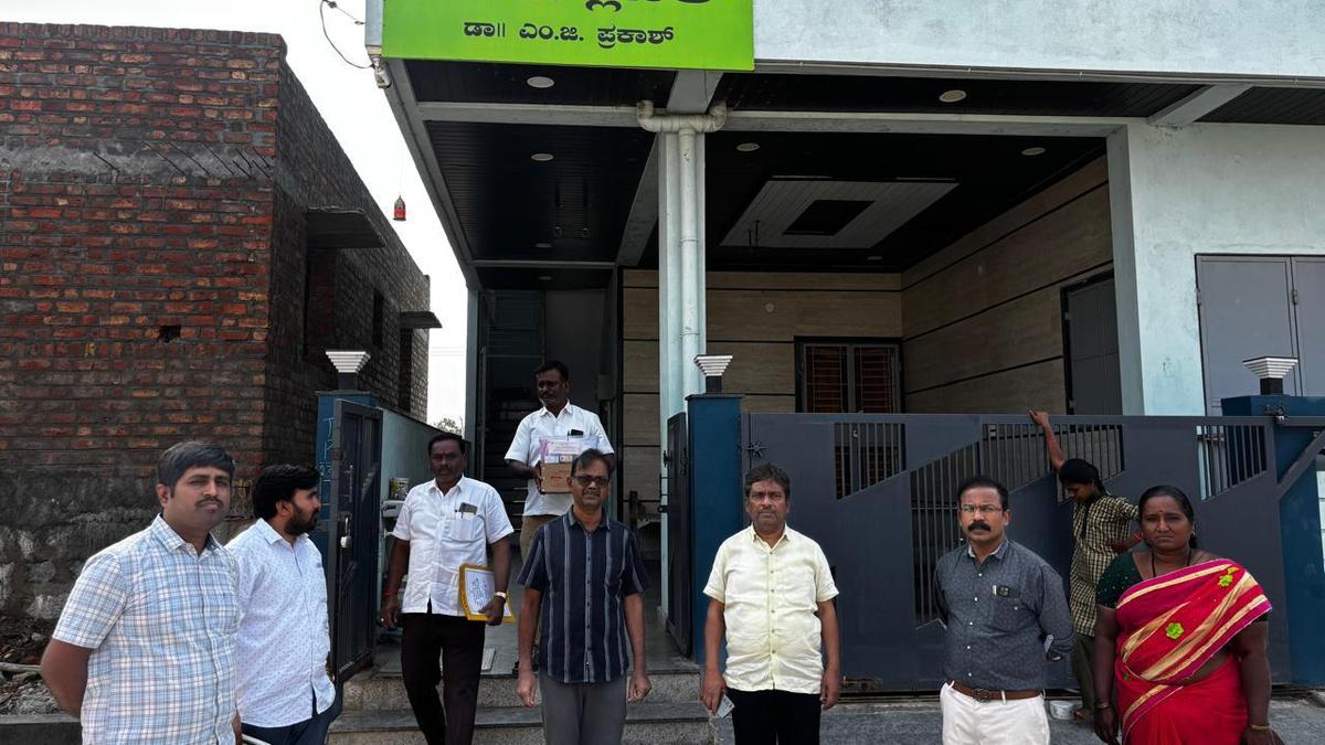 Health Department officials outside MG Clinic in Sirivara village of Ballari taluk on Thursday after sealing the premises for violating the Karnataka Private Medical Establishments Act.
