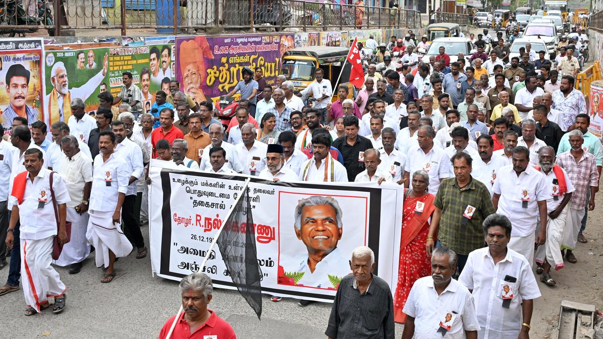 Cadres of various political parties take out a silent procession to condole the demise of veteran CPI leader R. Nallakannu in Madurai on Thursday. | Photo Credit: R. Ashok Members of various political parties jointly took out a silent procession in Madurai on Thursday to pay homage to freedom fighter and veteran Communist leader R. Nallakannu, who passed away in Chennai on Wednesday. The cadres took out the silent rally from Arapalayam Cross Road to Pechiamman Padithurai. The rally was organised by the Communist Party of India. A memorial meeting was also held following the silent rally. Leaders of various political parties paid their tributes to Nallakannu. Published – February 26, 2026 11:59 pm IST Share this: Click to share on WhatsApp (Opens in new window) WhatsApp Click to share on Facebook (Opens in new window) Facebook Click to share on Threads (Opens in new window) Threads Click to share on X (Opens in new window) X Click to share on Telegram (Opens in new window) Telegram Click to share on LinkedIn (Opens in new window) LinkedIn Click to share on Pinterest (Opens in new window) Pinterest Click to email a link to a friend (Opens in new window) Email More Click to print (Opens in new window) Print Click to share on Reddit (Opens in new window) Reddit Click to share on Tumblr (Opens in new window) Tumblr Click to share on Pocket (Opens in new window) Pocket Click to share on Mastodon (Opens in new window) Mastodon Click to share on Nextdoor (Opens in new window) Nextdoor Click to share on Bluesky (Opens in new window) Bluesky Like this:Like Loading... Post navigation Withholding pension of retired employee illegal, rules KSHRC A sociologist and propagandist of democratic values