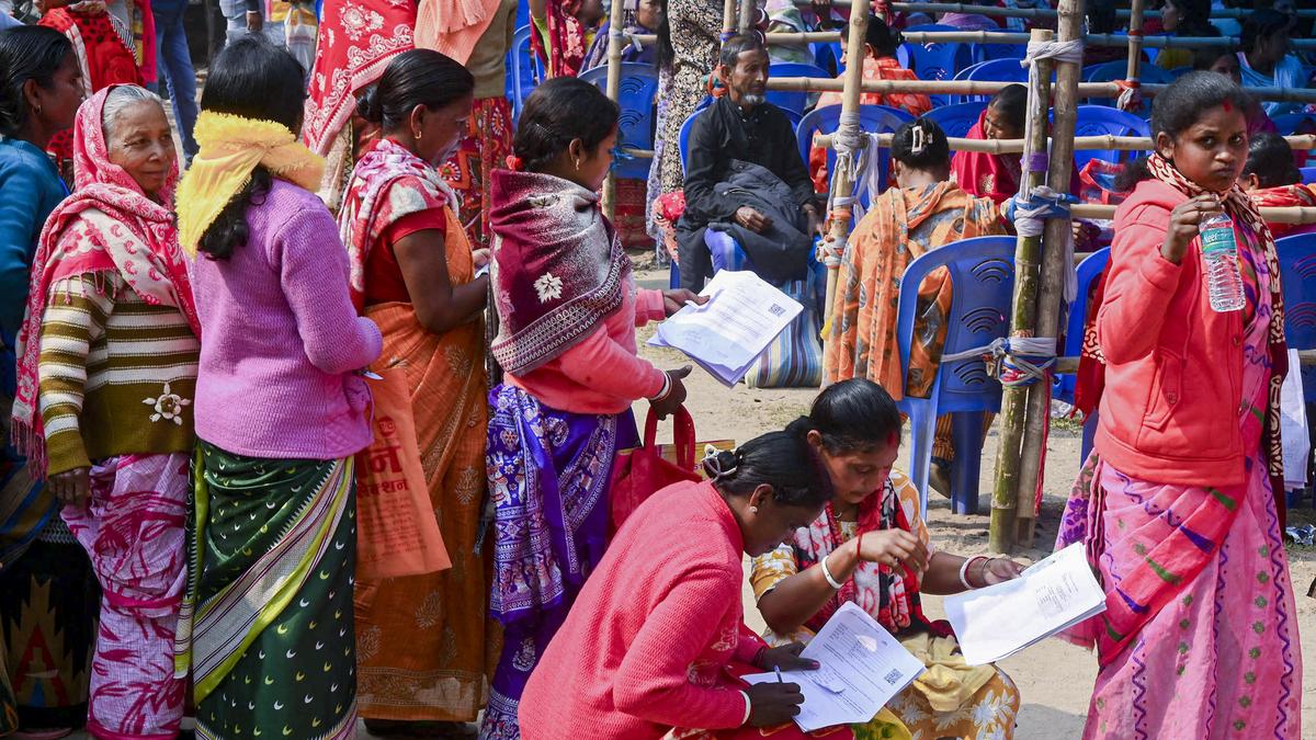 People wait in queues at a centre during hearings under the Special Intensive Revision (SIR) of electoral rolls, in Balurghat, Dakshin Dinajpur district, West Bengal, on Tuesday, January 20, 2026.