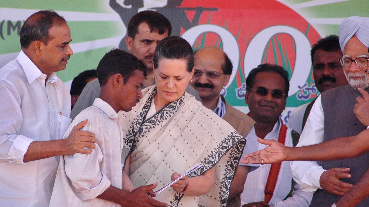 Congress president Sonia Gandhi hands over a job card to a villager during the inauguration of the National Rural Employment Guarantee Programme at Bandlapalli on February 2, 2006, as then Prime Minister Manmohan Singh and Chief Minister Y. S. Rajasekhara Reddy look on.