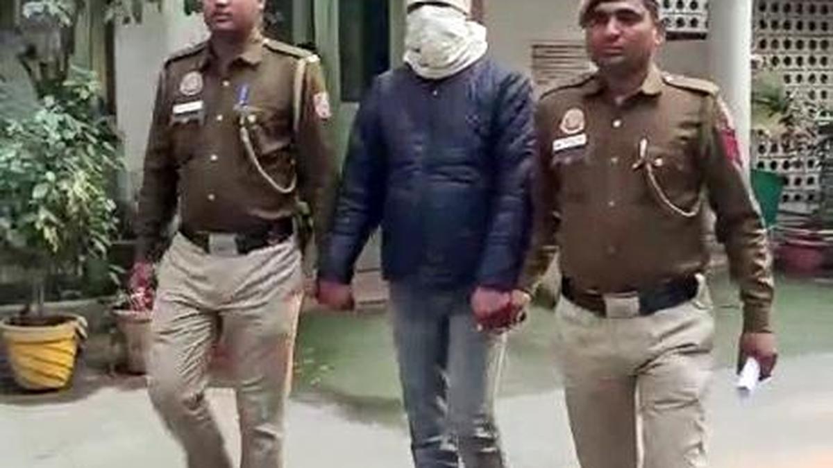 Police personnel with subcontractor Rajesh Prajapati after arresting him on Saturday.