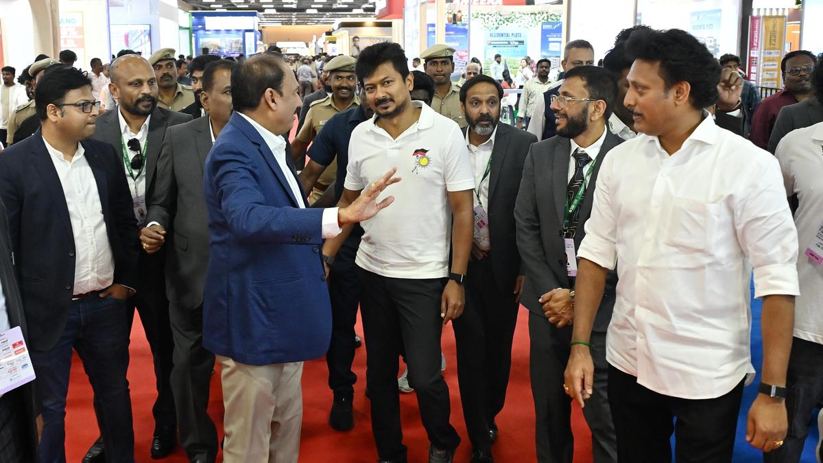 Tamil Nadu Deputy Chief Minister Udhayanidhi Stalin and School Education Minister Anbil Mahesh Poyyamozhi visiting the stalls at CREDAI FAIRPRO 2026 in Nandambakkam on Friday.