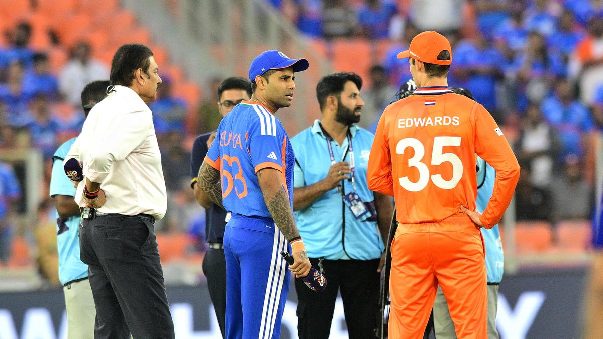 India Captain Suryakumar Yadav and Netherlands Captain Scott Edwards during the toss of the ICC Men’s T20 World Cup Cricket match between India and Netherland at Narendra Modi Stadium in Ahmedabad, Gujarat on February 18, 2026. | Photo Credit: Vijay Soneji India captain Suryakumar Yadav won the toss and opted to bat against the Netherlands in their T20 World Cup Group A clash, in Ahmedabad on Wednesday (February 18, 2026). India is coming off a massive 61-run win over Pakistan, which also cemented their place in the Super Eights. The Netherlands had lost to the USA by a huge 93-run margin in their last outing. India made two changes, resting vice-captain Axar Patel and Kuldeep Yadav and bringing in Washington Sundar and Arshdeep Singh. The Netherlands made one change to their side, bringing in Noah Croes for Fred Klaassen. Teams: India: Ishan Kishan (wk), Abhishek Sharma, Tilak Varma, Suryakumar Yadav (c), Hardik Pandya, Rinku Singh, Shivam Dube, Washington Sundar, Jasprit Bumrah, Arshdeep Singh, Varun Chakravarthy. Netherlands: Michael Levitt, Max O’Dowd, Bas de Leede, Colin Ackermann, Scott Edwards (c&wk), Zach Lion-Cachet, Roelof van der Merwe, Logan van Beek, Aryan Dutt, Kyle Klein, Noah Croes. Published – February 18, 2026 06:58 pm IST Share this: Click to share on WhatsApp (Opens in new window) WhatsApp Click to share on Facebook (Opens in new window) Facebook Click to share on Threads (Opens in new window) Threads Click to share on X (Opens in new window) X Click to share on Telegram (Opens in new window) Telegram Click to share on LinkedIn (Opens in new window) LinkedIn Click to share on Pinterest (Opens in new window) Pinterest Click to email a link to a friend (Opens in new window) Email More Click to print (Opens in new window) Print Click to share on Reddit (Opens in new window) Reddit Click to share on Tumblr (Opens in new window) Tumblr Click to share on Pocket (Opens in new window) Pocket Click to share on Mastodon (Opens in new window) Mastodon Click to share on Nextdoor (Opens in new window) Nextdoor Click to share on Bluesky (Opens in new window) Bluesky Like this:Like Loading... Post navigation The Centre and the margins Doctors’ strike affecting patient care at MCHs