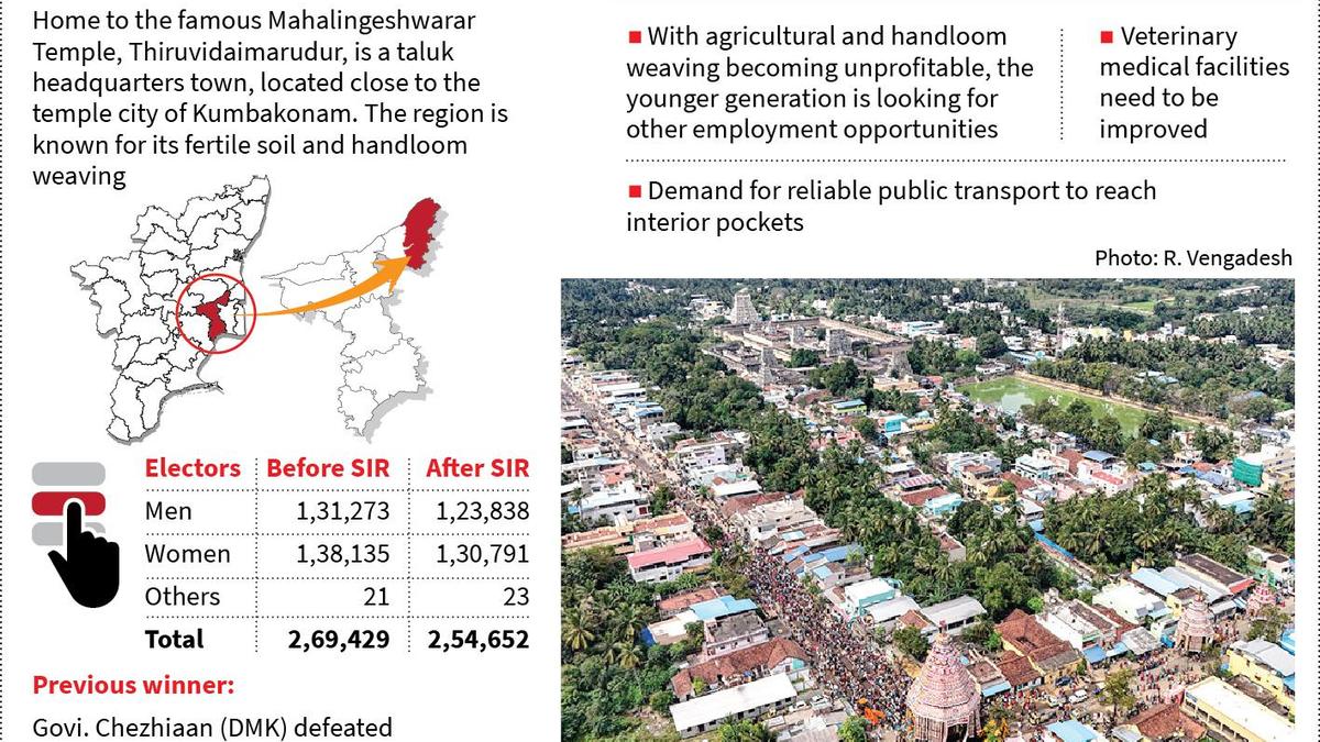 Located on Thanjavur-Mayiladuthurai border, Thiruvidaimarudur is a reserved Assembly constituency. While the traditional livelihood of voters here is farming and weaving, the younger generation apppears disinclined to pursue them. Agriculture is the core activity in this old delta region, and handloom weaving too has thrived here for generations. Thirubhuvanam, located in this constituency, is well-known for its one-side border filature silk sarees, while weaving of cotton dhoti flourished at nearby Thugili, a diminutive settlement, until a few centuries ago. Published – April 07, 2026 06:54 pm IST Share this: Click to share on WhatsApp (Opens in new window) WhatsApp Click to share on Facebook (Opens in new window) Facebook Click to share on Threads (Opens in new window) Threads Click to share on X (Opens in new window) X Click to share on Telegram (Opens in new window) Telegram Click to share on LinkedIn (Opens in new window) LinkedIn Click to share on Pinterest (Opens in new window) Pinterest Click to email a link to a friend (Opens in new window) Email More Click to print (Opens in new window) Print Click to share on Reddit (Opens in new window) Reddit Click to share on Tumblr (Opens in new window) Tumblr Click to share on Pocket (Opens in new window) Pocket Click to share on Mastodon (Opens in new window) Mastodon Click to share on Nextdoor (Opens in new window) Nextdoor Click to share on Bluesky (Opens in new window) Bluesky Like this:Like Loading... Post navigation Aditya Varma takes charge as ITDA Project Officer in Paderu ISL: Blasters stun Bengaluru, record first win