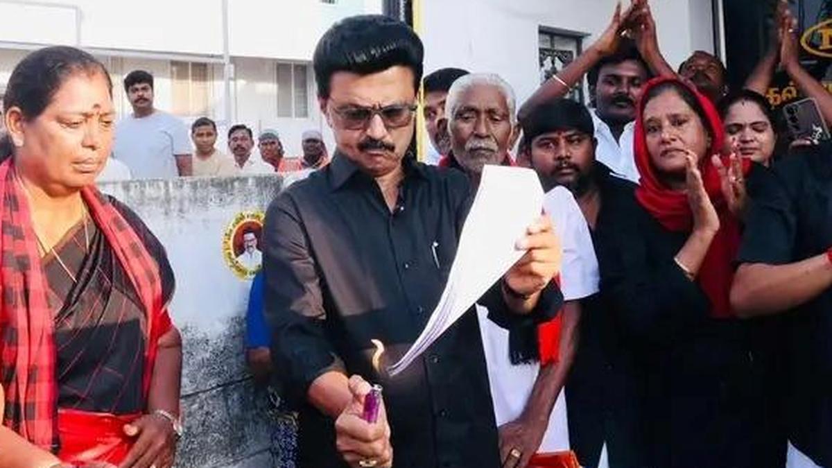 The DMK president M.K. Stalin burning a copy of the Delimitation Bill and staging a protest against it at Namakkal in Tamil Nadu on April 16, 2026. Photo: Special Arrangement Tamil Nadu Chief Minister M.K. Stalin burnt a copy of the Delimitation Bill as part of the statewide protest in Namakkal on Thursday (April 16, 2026). Against the proposed amendment on delimitation, the Bill to be tabled in Parliament on Thursday (April 16, 2026), the DMK president and Chief Minister called it a ‘conspiracy and a black law’. He urged people to hoist black flags in every home and public place on Thursday (April 16, 2026). Published – April 16, 2026 09:25 am IST Share this: Click to share on WhatsApp (Opens in new window) WhatsApp Click to share on Facebook (Opens in new window) Facebook Click to share on Threads (Opens in new window) Threads Click to share on X (Opens in new window) X Click to share on Telegram (Opens in new window) Telegram Click to share on LinkedIn (Opens in new window) LinkedIn Click to share on Pinterest (Opens in new window) Pinterest Click to email a link to a friend (Opens in new window) Email More Click to print (Opens in new window) Print Click to share on Reddit (Opens in new window) Reddit Click to share on Tumblr (Opens in new window) Tumblr Click to share on Pocket (Opens in new window) Pocket Click to share on Mastodon (Opens in new window) Mastodon Click to share on Nextdoor (Opens in new window) Nextdoor Click to share on Bluesky (Opens in new window) Bluesky Like this:Like Loading... Post navigation Three killed, three others injured as lorry collides with tractor trolley and autorickshaw in Aswaraopet Rupee rises 10 paise to settle at 93.23 against U.S. dollar