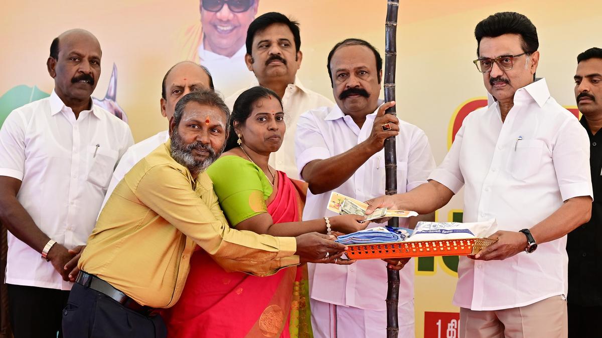 Tamil Nadu Chief Minister M.K. Stalin launches distribution of Pongal gift hampers in Chennai on January 8, 2026 | Photo Credit: B. Velankanni Raj Tamil Nadu Chief Minister M.K. Stalin, on Thursday (January 8, 2026), launched the distribution of Pongal gift hampers to eligible rice ration card holders and Sri Lankan Tamils living in camps across the State, during an event at a fair price shop at Butt Road in Alandur, Chennai. The Pongal gift hamper includes one kilogram of raw rice, one kilogram of sugar and one full sugarcane along with ₹3,000 in cash. This gift hamper will be distributed to 2,22,91,710 rice ration card holders and Sri Lankan Tamil families residing in rehabilitation camps. As part of the free dhoti and sari distribution scheme, over 1,77,64,000 saris and 1,77,22,000 dhotis are set to be distributed through ration shops. Tokens specifying date and time to receive the Pongal gift hampers have been issued to eligible rice ration card holders. These gift hampers will be distributed over five days from Thursday until January 12. State Minister for Cooperation K.R. Periakaruppan, Minister for Micro, Small and Medium Enterprises T.M. Anbarasan, Minister for Food and Civil Supplies R. Sakkarapani, Minister for Health and Family Welfare Ma. Subramanian, MPs T.R. Baalu, Thamizhachi Thangapandian and senior government officials were among others present. Published – January 08, 2026 02:31 pm IST Share this: Click to share on WhatsApp (Opens in new window) WhatsApp Click to share on Facebook (Opens in new window) Facebook Click to share on Threads (Opens in new window) Threads Click to share on X (Opens in new window) X Click to share on Telegram (Opens in new window) Telegram Click to share on LinkedIn (Opens in new window) LinkedIn Click to share on Pinterest (Opens in new window) Pinterest Click to email a link to a friend (Opens in new window) Email More Click to print (Opens in new window) Print Click to share on Reddit (Opens in new window) Reddit Click to share on Tumblr (Opens in new window) Tumblr Click to share on Pocket (Opens in new window) Pocket Click to share on Mastodon (Opens in new window) Mastodon Click to share on Nextdoor (Opens in new window) Nextdoor Click to share on Bluesky (Opens in new window) Bluesky Like this:Like Loading... Post navigation Madhav Gadgil’s divisive legacy in Western Ghats: Respect from conservationists, scepticism from local communities Rare January system over Bay of Bengal set to bring heavy rainfall to parts of T.N.