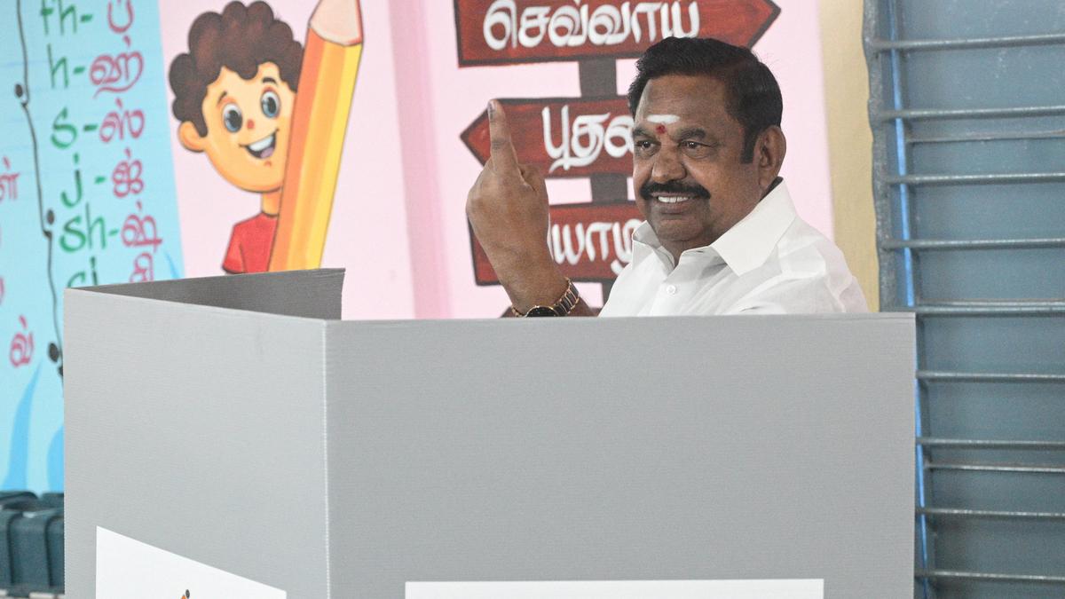 AIADMK general secretary, Edappadi K. Palaniswami showing the indelible ink mark on his finger after casting his vote at a polling booth in Siluvampalayam village near Edappadi town in Salem district in Tamil Nadu on Thursday. | Photo Credit: E. Lakshmi Narayanan Former Chief Minister and general secretary of the AIADMK, Edappadi K. Palaniswami, and Tourism Minister R. Rajendran cast their votes in Salem on Thursday (April 23, 2026). Mr. Palaniswami, along with his family members, came to the Nedunkulam Panchayat Union Primary School at Siluvampalayam in Edappadi on Thursday morning and cast his vote. Published – April 23, 2026 08:43 pm IST Share this: Click to share on WhatsApp (Opens in new window) WhatsApp Click to share on Facebook (Opens in new window) Facebook Click to share on Threads (Opens in new window) Threads Click to share on X (Opens in new window) X Click to share on Telegram (Opens in new window) Telegram Click to share on LinkedIn (Opens in new window) LinkedIn Click to share on Pinterest (Opens in new window) Pinterest Click to email a link to a friend (Opens in new window) Email More Click to print (Opens in new window) Print Click to share on Reddit (Opens in new window) Reddit Click to share on Tumblr (Opens in new window) Tumblr Click to share on Pocket (Opens in new window) Pocket Click to share on Mastodon (Opens in new window) Mastodon Click to share on Nextdoor (Opens in new window) Nextdoor Click to share on Bluesky (Opens in new window) Bluesky Like this:Like Loading... Post navigation Iran offers to end chokehold on Strait of Hormuz, asks U.S. to end blockade Tamil Nadu election 2026: Over 80% polling in Thanjavur, Tiruvarur districts