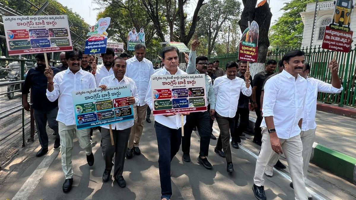 BRS legislators going to the Assembly holding placards on the unkept six guarantees in Hyderabad on March 20, 2026 | Photo Credit: Special Arrangement The Bharat Rashtra Samithi (BRS) legislators, led by its working president K.T. Rama Rao and Deputy Floor Leader of the party in the Assembly T. Harish Rao staged a protest at the Gun Park in front of the Assembly Buildings before the presentation of the budget for 2026-27 by the government on Friday (March 20, 2026). Telangana Budget 2026-27 updates They displayed placards in the name of “debt cards” with slogans on the unkept promises made as part of the Six Guarantees and a large number of other promises made by the Congress party before the 2023 Assembly elections. They sought to know when the government would pay ₹54,000 due to the differently-abled persons, unemployment allowance, when two-lakh jobs would be filled and ₹24,000 due to auto-drivers. Further, they sought to know when the government would clear ₹54,000 dues to every aged person getting social security ‘Aasara’ pension, as the Congress had promised to enhance it from ₹2,000 to ₹4,000 per month. They also demanded that the government provide legislation backing the Six Guarantees as promised. Later, they proceeded to the Assembly with the placards. Speaking there, Mr. Rama Rao reminded the ruling party that it had promised to implement and fulfil all the six guarantees within three months of coming to power by had failed to keep the word though it was presenting its third budget. He sought to know why the government was not implementing the promise to give a monthly assistance of ₹2,500 per month to women, ₹6,000 per month pension to differently-abled persons, ₹15,000 per acre Rythu Bharosa assistance to farmers and filling 2 lakh jobs every year. Published – March 20, 2026 01:06 pm IST Share this: Click to share on WhatsApp (Opens in new window) WhatsApp Click to share on Facebook (Opens in new window) Facebook Click to share on Threads (Opens in new window) Threads Click to share on X (Opens in new window) X Click to share on Telegram (Opens in new window) Telegram Click to share on LinkedIn (Opens in new window) LinkedIn Click to share on Pinterest (Opens in new window) Pinterest Click to email a link to a friend (Opens in new window) Email More Click to print (Opens in new window) Print Click to share on Reddit (Opens in new window) Reddit Click to share on Tumblr (Opens in new window) Tumblr Click to share on Pocket (Opens in new window) Pocket Click to share on Mastodon (Opens in new window) Mastodon Click to share on Nextdoor (Opens in new window) Nextdoor Click to share on Bluesky (Opens in new window) Bluesky Like this:Like Loading... Post navigation Runaway couple protection plea mentioned in Supreme Court, CJI asks lawyer to move Delhi HC Supreme Court allows bail to former police officer Rajesh Das in sexual harassment case