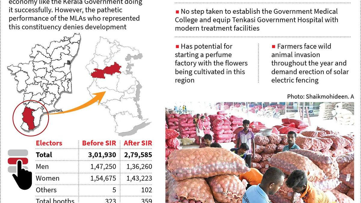 Tenkasi Assembly segment, having immense potential for tourism with Courtallam and the scenic Western Ghats and farming with sufficient water resources, is waiting indefinitely for a right representative who can get sufficient assistance from the government for taking this region to the next level. Tenkasi Assembly segment has elected MLAs affiliated to the Congress, DMK, AIADMK and even an independent in 1957. It elected in 2011, actor R. Sarathkumar, founder of Samaththuva Makkal Katchi, which was merged with the BJP recently. Congress candidate S. Palani Nadar, who lost the 2016 election polls to AIADMK’s S. Selvamohandas Pandian, avenged for his defeat in 2021 with the insignificant margin of 370 votes. Even as everyone was expecting the renewal of this rivalry in the 2026 election too, the DMK has decided to field its senior party office-bearer ‘Anbagam’ Kalai’s son, Kalai Kathiravan, in Tenkasi to take on AIADMK’s Mr. Selvamohandas Pandian. Like the district’s predominant profession of farming, Tenkasi Assembly segment’s economy is based on agriculture and Courtallam-based tourism activities. Unfortunately, both the livelihood activities are yet to thrive in a big way, thanks to the pathetic performance of the MLAs who represented this constituency in the past. The farming activities revolve around paddy, plantain and coconut cultivation. Since the farms are very close to the Western Ghats, invasion of wild animals into the ranches to cause extensive damage to the standing crops and occasional man – animal conflict too to trigger panic. “The government should erect solar fence along the boundary of reserve forest and farms to save the farmers, who suffer huge loss every year,” says farmer Balasubramanian of Kasimajorpuram near Courtallam. The farmers also want the government to desilt the dams periodically, particularly during the dry seasons, so as to store maximum quantity of water in the reservoirs. “The government’s failure to desilt the dams has resulted in wasting of precious water during the southwest and northeast monsoons. So, government should concentrate on this issue at regular intervals,” Mr. Balasubramanian says. The SIDCO Industrial Estate created in Tenkasi segment for housing a range of manufacturing units including clothing, handicraft, plastic products, packaging etc. is in shambles. Unfortunately, no step has been taken to revive this eroding industrial estate. While the girl students, after their Plus Two, can join the courses being offered by Sri Parasakthi College for Women, Courtallam, the boys have to depend on the private arts and science colleges. Medical facilities “While the previous AIADMK government managed to get 11 medical colleges in one year, the present DMK government failed miserably to get at least one medical college for Tamil Nadu. And, Tenkasi is one among the six districts waiting for their medical college, which shows the inability of the Department of Public Health,” says a doctor working with the Tenkasi Government Hospital, which is also waiting for hitech medical facilities and is sending its patients to Tirunelveli Medical College Hospital for advanced medical assistance. Even though Courtallam would be inundated with the tourists from various parts of the country during the ‘annual season’ between June and August every year as all waterfalls in this tourist destination would be swelling thanks to the active southwest monsoon along the Western Ghats, there is no basic infrastructure in this small town. Courtallam is waiting for decades for better tourist-friendly infrastructure like encroachment-free motorable roads, drinking water, affordable stay, eateries serving quality and hygienic food etc. Even though the main roads of Courtallam are in good shape, the interior roads are in the worst condition and the encroachments made along these already narrow roads make motoring dangerous. “We’ve to blame the Courtallam town panchayat administration for this deplorable condition of Courtallam. While funds allocated for Courtallam is not sufficient, corruption at all levels of Courtallam town panchayat administration The recent removal of the century-old concrete arch at Main Falls has also deeply hurt the public, especially the Courtallam residents. “We agree that huge number of people cannot take bath simultaneously in the Main Falls due to the concrete arch. But, it was the protective structure that saved the bathers from being washed away during heavy flow. And, it was not in a dilapidated condition as being claimed by the officials. The uncompromised quality of this structure withstood millions of tonnes of water all these years. Let’s see the quality of the structure going to be created at this spot by the modern day rulers as we’re witness to these modern day rulers’ dressing rooms near Main Falls and the Old Courtallam waterfalls washed away in the floods,” says S. Senthur Pandian, a trader from Courtallam. While the Pavoorchatram vegetable market being operated by the private players does wonders by supplying the fruits and vegetables in more than one hundred lorries to various parts of Tamil Nadu and neighbouring Kerala. The State Government refuses to start such a venture by creating a farmers’ society to sell the farm produces cultivated in this region known as ‘Vegetable Basket of Southern Tamil Nadu’. “More importantly, the government is yet to concentrate on value-addition of the farm produce using fruits, vegetables and flowers, all being grown in larger areas of Tenkasi district,” says vegetable trader M. Kutralingam of Paavoorchathram. Published – April 05, 2026 10:09 pm IST Share this: Click to share on WhatsApp (Opens in new window) WhatsApp Click to share on Facebook (Opens in new window) Facebook Click to share on Threads (Opens in new window) Threads Click to share on X (Opens in new window) X Click to share on Telegram (Opens in new window) Telegram Click to 