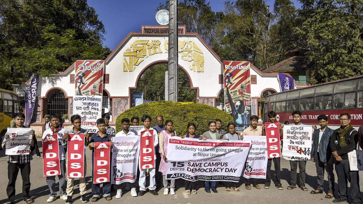 A file photo shows members of All India Democratic Students’ Organisation (AIDSO) staging a demonstration in solidarity with the Tezpur University students’ protest. | Photo Credit: PTI The Ministry of Education (MoE) has ordered Tezpur University Vice-Chancellor Shambhu Nath Singh to go on leave and directed an enquiry panel to probe several allegations against him, according to officials. The university has been witnessing protests since mid-September against irregularities allegedly committed by Mr. Singh. The protesters held a 24-hour hunger strike on Monday ( December 29, 2025) on the completion of 100 days of their agitation. “A three-member enquiry panel has been set up to probe all matters related to the ongoing situation in Tezpur University, including allegations levelled against the Vice-Chancellor. The VC shall recuse himself from all duties and proceed on leave immediately and shall remain on leave till completion of the enquiry,” a senior MoE official said. The enquiry panel has been asked to submit its report within a maximum of three months. Pro VC appointed Meanwhile, the Ministry has appointed Amrendra Kumar Das from IIT Guwahati’s Department of Design as Pro Vice-Chancellor of Tezpur University. The situation in the University has been tense since mid-September, with students accusing the VC and institute authorities of not showing due respect to cultural icon Zubeen Garg, even as the State was mourning the singer’s death. Apart from alleged fiscal irregularities, deforestation and ecological destruction were also reported at the picturesque campus during Mr. Singh’s administration. The VC abstained from the campus after the university witnessed heated scenes and an exchange of words between him and students on September 22, leading to a situation where Mr. Singh had to nearly flee the spot. At least 11 faculty members and senior officials have resigned since the protests began in September. Published – January 01, 2026 05:58 pm IST Share this: Click to share on WhatsApp (Opens in new window) WhatsApp Click to share on Facebook (Opens in new window) Facebook Click to share on Threads (Opens in new window) Threads Click to share on X (Opens in new window) X Click to share on Telegram (Opens in new window) Telegram Click to share on LinkedIn (Opens in new window) LinkedIn Click to share on Pinterest (Opens in new window) Pinterest Click to email a link to a friend (Opens in new window) Email More Click to print (Opens in new window) Print Click to share on Reddit (Opens in new window) Reddit Click to share on Tumblr (Opens in new window) Tumblr Click to share on Pocket (Opens in new window) Pocket Click to share on Mastodon (Opens in new window) Mastodon Click to share on Nextdoor (Opens in new window) Nextdoor Click to share on Bluesky (Opens in new window) Bluesky Like this:Like Loading... Post navigation Ideology, incumbency, polarisation: Key Indian elections to watch in 2026 Hold correspondence for NAAC accreditation in Kannada: Department of Collegiate Education orders colleges