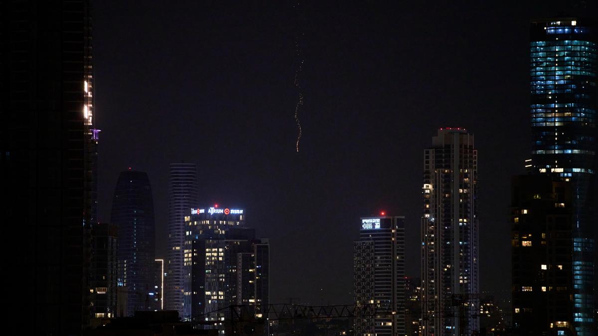 Missiles launched from Iran streak across the sky over central Israel, early Monday, March 23, 2026.
