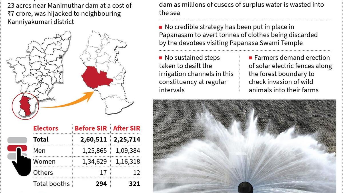 The Ambasamudram Assembly constituency along the lap of the Western Ghats, which has been blessed with three prime reservoirs but left with a lot of infrastructural problems, is all set to witness a battle between the AIADMK and the Congress this time. While winners of the very first Assembly election held in Tamil Nadu in the early 50s were all Indian National Congress candidates, Ambasamudram constituency preferred to choose Independent candidate P. Chockalingam over Congress contestant Lakshmi Sankara Iyer in the first poll held in 1952. However, ‘business’ became ‘as usual’ in the next election as Congress candidate G. Gomathisankara Dikshidar got elected to the Assembly in 1957 and he continued the wining streak till 1967 even when the DMK emerged victorious in this election and formed the government under the leadership of C. N. Annadurai. In the next election held in 1971 too, Congress candidate S. Sangumuthu Thevar won the battle. The CPI (M) emerged victorious for the first time in 1977 as its candidate Eswaramoorthy alias Sornam got elected by defeating veteran CPI leader R. Nallakannu by 1,787 votes. He was elected to the Assembly for the second consecutive term in 1980. The AIADMK won Ambasamudram for the first time in 1984 but lost it in the next election in 1989 to the Congress and retained it in 1991. When AIADMK supremo fell out of the voters’ favour in 1996, DMK’s R. Avudaiyappan bagged this constituency for the first time and the second time in 2006 to became Speaker of Tamil Nadu Assembly. However, Mr. Avudaiyappan suffered unforgettable defeats in the next three elections – in 2011, 2016 and 2021 – at the hands of AIADMK candidates. And, the painful ‘hat-trick debacle’ has forced the DMK to handover the Ambasamudram constituency to the Congress for the April 23 polls. Though the national party is yet to announce its candidate with intra-party confusion over candidates reaching crescendo, advocate Kamaraj or former MLA Veldurai’s son V.P. Durai may be fielded to take-on AIADMK’s Esakki Subaya, who got elected twice from this segment in 2011 and 2021. He served as Minister of Law in the Jayalalithaa’s Cabinet in 2011 and got dismissed from the ministership within 2 months. The Vijay-led Tamilaga Vetri Kazhagam and Seeman’s Naam Thamizhar Katchi too have fielded little known candidates in the fray. Even though this constituency, blessed with good water resources with Papanasam, Manimuthar and Servalar dams taking care of agricultural operations, has elected candidates from different political parties, the perennial problems still exist as none of these members neither understood nor worked to alleviate these problems. Even though the ruling DMK had announced that the Tamil Nadu Government would study the possibilities of taking Papanasam dam’s surplus water to Manimuthar dam, the district’s largest reservoir with the capacity of 5,511 mcft, by digging a linking channel, no step has been taken so far. Since Papanasam dam would be the first major reservoir to overflow owing to good rainfall in the catchment areas in the Western Ghats almost every year, the surplus water would be released in the 122-Km-long Tamirabharani River, which would get drained into the Gulf of Mannar near Punnaikaayal in Thoothukudi district. This agonizing wastage of ‘White Gold’ continues even after the 73 Km-long flood carrier channel was dug to connect Tamirabharani – Karumaeniyar – Nambiyar Rivers to take the surplus flood water of the Tamirabharani to dry Nanguneri, Thisaiyanvilai and Sattankulam areas. Even as the flood water is wasted, the Manimuthar Dam would be waiting anxiously every year to reach its maximum level of 118 feet as rainfall in the catchment areas of this dam is relatively not that good. Hence, the digging of channel to connect Papanasam and Manimuthar dams was proposed even though the Tamil Nadu Government would have to obtain permission from the National Tiger Conservation Authority since both the dams and the path for the proposed linking channel are located inside Kalakkad – Mundanthurai Tiger Reserve. But, the government is silent on this vital issue which has upset the farmers. Another nagging issue the farmers here face every year is the inadequate paddy storage facility as the paddy being harvested in the fields from Papanasam to Gopalasamudram have to be stored before and after being sold at the direct procurement centre. Even after Chief Minister M. K. Stalin announced in September 2022 that Biodiversity Park with adventure sports would be created on 23 acres near Manimuthar dam at the cost of ₹7 crore, not even a brick has been kept to mark the start of this project. Instead, it was hijacked to neighbouring Kanniyakumari district following politics by the top-brass of Department of Forest. Invasion of wild animals into the ranches is a major problem being encountered by the farmers of Ambasamudram. “Even though we demand erection of solar electric fence along the forest boundary, the government is in no mood to sanction fund for this project,” says P. Perumbadaiyar, state vice-president of Tamil Nadu Vivasaayigal Sangam. Even though the Manjola tea estate workers of this constituency have been asked to vacate their decades-old scenic birthplace after the tea factory management wound-up its operations, a small number of families are still living there as they do not want come to the plains after accepting the government’s relief package, which has become a problem for the locals and the official machinery. Even though tonnes of used clothes are being discarded in the Tamirabharani at Papanasam every week as the devotees follow this ritual for decades, no measure has been put in place to check this serious pollution of the river. And, no sustained measure is being followed to desilt the irrigation channels in Ambasamudram at regular intervals. Published – April 02, 2026 09:15 pm IST Share this: Click to share on Wh