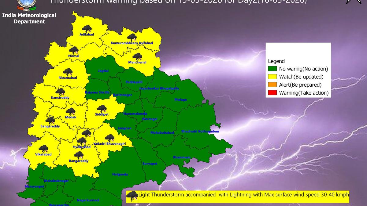 The India Meteorological Department (IMD) has issued a thunderstorm warning in 14 Telangana districts for Monday, March 16 | Photo Credit: India Meteorological Department The India Meteorological Department (IMD) has issued a thunderstorm warning in 14 Telangana districts for Monday (March 16, 2026) According to IMD’s latest bulletin, thunderstorms accompanied by lightning and gusty winds are very likely to occur at isolated places in Adilabad, Kumaram Bheem Asifabad, Mancherial, Nirmal, Nizamabad, Siddipet, Yadadri Bhongir, Rangareddy, Hyderabad, Medchal Malkajgiri, Vikarabad, Sangareddy, Medak and Kamareddy districts. Hyderabad and its neighbourhood areas for the next 24 hours will see partly cloudy sky. “Hazy conditions are very likely to prevail during morning hours. The maximum and minimum temperatures are likely to be around 36 and 23 respectively,” the bulletin said. Published – March 15, 2026 03:48 pm IST Share this: Click to share on WhatsApp (Opens in new window) WhatsApp Click to share on Facebook (Opens in new window) Facebook Click to share on Threads (Opens in new window) Threads Click to share on X (Opens in new window) X Click to share on Telegram (Opens in new window) Telegram Click to share on LinkedIn (Opens in new window) LinkedIn Click to share on Pinterest (Opens in new window) Pinterest Click to email a link to a friend (Opens in new window) Email More Click to print (Opens in new window) Print Click to share on Reddit (Opens in new window) Reddit Click to share on Tumblr (Opens in new window) Tumblr Click to share on Pocket (Opens in new window) Pocket Click to share on Mastodon (Opens in new window) Mastodon Click to share on Nextdoor (Opens in new window) Nextdoor Click to share on Bluesky (Opens in new window) Bluesky Like this:Like Loading... Post navigation Rahul writes to PM Modi, seeks Bharat Ratna for BSP founder Kanshi Ram Former Pakistan captain Sarfaraz Ahmed announces retirement