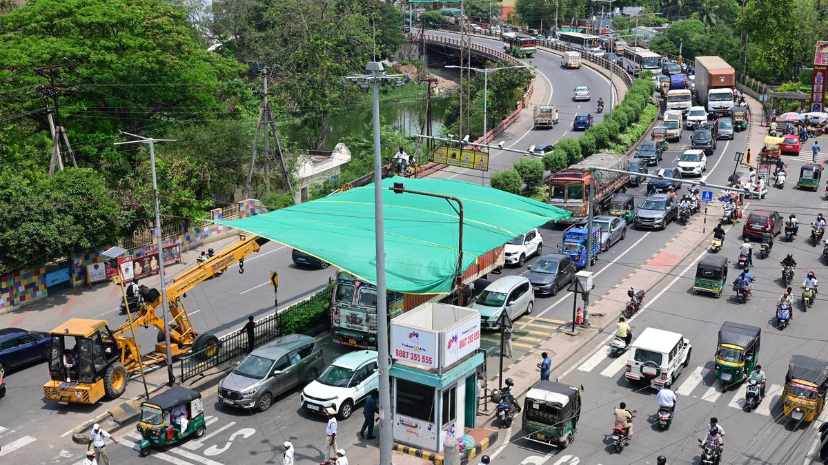 With temperatures steadily rising in Vijayawada, the Traffic Police wing of the Vijayawada Police has begun installing temporary green shade nets at key and busy traffic junctions across the city. | Photo Credit: G.N. Rao Thunderstorms and light showers in Andhra Pradesh are likely to continue for another week and at the same time, maximum temperatures are also likely to see a gradual rise, said the India Meteorological Department (IMD), Amaravati. Thunderstorms, lightning and gusty winds touching 50 kmph are likely to prevail at isolated places in coastal Andhra Pradesh, Yanam and Rayalaseema until March 26. Currently, all stations in the State are recording normal maximum temperatures, with no deviations. While the maximum temperatures hovered around 38 degrees Celsius in Rayalaseema in this week, the temperatures in the remaining parts of the State remained around 35-37 degrees Celsius. The maximum temperatures are likely to rise by 2 degrees Celsius, Senior Scientist, IMD-Amaravati, S. Karunasagar, said. “There will be light showers in some places, and there may be a rise in daytime temperatures in some other places in the next week,” Mr. Karunasagar said, adding that there is nothing unusual about the current weather pattern in the State. According to the IMD’s weekly forecast, the upper air cyclonic circulation over South Interior Karnataka and neighbourhood persists, and is at 1.5 km above mean sea level. The trough from Gulf of Mannar to South Madhya Maharashtra, across Tamil Nadu and interior Karnataka, also persists. Currently, lower tropospheric South Easterly/South Westerly winds are prevailing over Andhra Pradesh and Yanam. Meanwhile, anticipating intense heat in the coming days in NTR district and Vijayawada, the traffic and fire departments have arranged a canopy of green shades at major traffic junctions in the city on an experimental basis. If there is a good feedback, the same would be extended to junctions across the city, said Deputy Commissioner of Police (DCP-Traffic) Shareen Begum. Published – March 22, 2026 08:38 pm IST Share this: Click to share on WhatsApp (Opens in new window) WhatsApp Click to share on Facebook (Opens in new window) Facebook Click to share on Threads (Opens in new window) Threads Click to share on X (Opens in new window) X Click to share on Telegram (Opens in new window) Telegram Click to share on LinkedIn (Opens in new window) LinkedIn Click to share on Pinterest (Opens in new window) Pinterest Click to email a link to a friend (Opens in new window) Email More Click to print (Opens in new window) Print Click to share on Reddit (Opens in new window) Reddit Click to share on Tumblr (Opens in new window) Tumblr Click to share on Pocket (Opens in new window) Pocket Click to share on Mastodon (Opens in new window) Mastodon Click to share on Nextdoor (Opens in new window) Nextdoor Click to share on Bluesky (Opens in new window) Bluesky Like this:Like Loading... Post navigation Karnataka SEC extends objections deadline for GBA electoral rolls to March 30 Nagapattinam eateries trim menu, raise prices amid LPG shortage