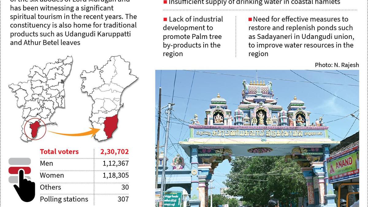 Tiruchendur, the town that houses the second abode of Lord Muruga on the shores of Bay of Bengal, is gearing up for the forthcoming Tamil Nadu general assembly elections, with several unresolved civic and infrastructural issues. Since 2001, the Tiruchendur constituency voters have consistently elected Anitha R. Radhakrishnan as their MLA, and it is to be noted that he was the MLA of AIADMK in 2001 and 2006, before joining DMK. However, the major town of the constituency, which is Tiruchendur and other parts continue to face several unresolved concerns. One of the major issues in Tiruchendur is rampant intrusions of sewage connections into the canal, which carries the surplus water of Avudayar Kulam, to the sea. Residents from the region believe that most of the lodges and hotels divert their drainage connections into the canal, leading to severe contamination. Ganesan, an autorickshaw driver from the region, said, “The canal carrying surplus water into the sea is contaminated and is choked by plastics and other wastes. The stench in the area is intolerable and has led to a mosquito menace.” He alleged that drainage connections from hotels, lodges and some houses have diverted into the canal. In addition, treated water pumped from the Tiruchendur municipality’s sewage treatment plant in Thoppur is also reportedly being discharged into the canal, Mr. Ganesan charged. He further said that the canal must be desilted and adequate measures taken to prevent sewage intrusion. Another major concern raised by residents of coastal hamlets in the constituency is inadequate supply of drinking water. Rani, a resident of Kulasekarapattinam, highlighted that they are provided with drinking water once a week and that too for a limited duration. “Though some houses in the village are provided with government drinking water tap connections, many houses are still left out, leading to long queues in the public drinking water tap points,” she added. Another resident from Veerapandiyapattinam also echoed the similar concern, noting that the government must take adequate measures to address the drinking water needs of coastal hamlets in the constituency. Ecological concerns related to sea accretion have become a huge concern among the fishermen of villagers, including Veerapandiyapattinam and Manappad. While the government has deployed earthmovers to remove the sand as a temporary measure, fishermen insist that scientific and long term solutions are required A fisherman of Veerapandiyapattinam said, “Though temporary remedial measures have been taken, they are not sustainable. Proper planning and permanent solutions are needed.” Another resident from the region pointed out, “If the government is constructing a groyne or other structures in the sea, they must assess the impact on nearby coastal villages to prevent further erosion or accretion.” The constituency also has GI tag awarded products such as Udangudi Karupatti and Athur Betel leaves. However, producers feel that there has been inadequate government support to promote these products. Gunaseelan, a Karuppatti trader from Udangudi, said that despite the region having one of the highest numbers of Palm trees in Tamil Nadu, there are no industrial developments to promote palm based by-products. “Many palm tappers are not even enrolled in the Palm Workers Welfare Board, as the board does not provide any significant subsidy or other welfare measures to these tappers. Actions must be taken to enroll palm tappers into these welfare boards, which further strengthens the community, as tappers in the region are steadily declining,” he added. Mr. Gunaseelan noted that adequate inspections must be carried out by FSSAI officials to promote quality karuppatti from the region. He also highlighted the need to replenish and restore tanks such as Sadayaneri Kulam in Udangudi union to increase the water resource in the dry region. “Every year around 1,200 cusecs of water is released from Marudhur anicut Sadayaneri Kulam. However, by the time it reaches the tank, only around 200 cusecs of water is available, which is not sufficient. The amount of water released from the anicut must be increased to boost the groundwater table in the region,” he noted. He added that around 60 buses from Udangudi are operating to Chennai, indicating migration due to lack of agriculture and industrial opportunities in the region, and stressed the need for local employment generation. Published – April 03, 2026 09:56 pm IST Share this: Click to share on WhatsApp (Opens in new window) WhatsApp Click to share on Facebook (Opens in new window) Facebook Click to share on Threads (Opens in new window) Threads Click to share on X (Opens in new window) X Click to share on Telegram (Opens in new window) Telegram Click to share on LinkedIn (Opens in new window) LinkedIn Click to share on Pinterest (Opens in new window) Pinterest Click to email a link to a friend (Opens in new window) Email More Click to print (Opens in new window) Print Click to share on Reddit (Opens in new window) Reddit Click to share on Tumblr (Opens in new window) Tumblr Click to share on Pocket (Opens in new window) Pocket Click to share on Mastodon (Opens in new window) Mastodon Click to share on Nextdoor (Opens in new window) Nextdoor Click to share on Bluesky (Opens in new window) Bluesky Like this:Like Loading... Post navigation Politicians make promises on Mullaperiyar dam only during poll time, say Cumbum farmers When Election Commission’s transfer of officers changed electioneering in Madurai