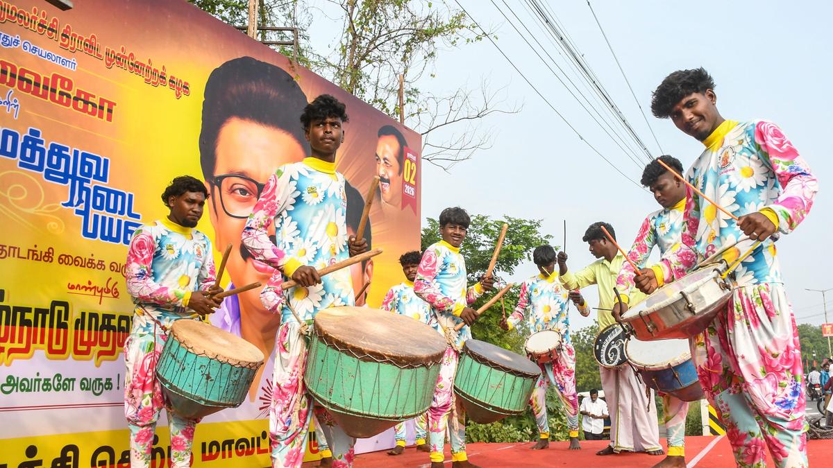 Drummers performing at a recent political campaign in Tiruchi. | Photo Credit: R. Selva Muthu Kumar Folk dancers and drummers attired in colour-coded costumes to match the political party, have brought verve and energy to campaign meetings in Tamil Nadu in the run-up to the Legislative Assembly elections. This year, the performances seem to resemble carnivals. Stilt walkers mingle with dancing gorilla mascots while dancers carrying large props of political party symbols thrill bystanders with showers of confetti. Published – April 17, 2026 07:11 pm IST Share this: Click to share on WhatsApp (Opens in new window) WhatsApp Click to share on Facebook (Opens in new window) Facebook Click to share on Threads (Opens in new window) Threads Click to share on X (Opens in new window) X Click to share on Telegram (Opens in new window) Telegram Click to share on LinkedIn (Opens in new window) LinkedIn Click to share on Pinterest (Opens in new window) Pinterest Click to email a link to a friend (Opens in new window) Email More Click to print (Opens in new window) Print Click to share on Reddit (Opens in new window) Reddit Click to share on Tumblr (Opens in new window) Tumblr Click to share on Pocket (Opens in new window) Pocket Click to share on Mastodon (Opens in new window) Mastodon Click to share on Nextdoor (Opens in new window) Nextdoor Click to share on Bluesky (Opens in new window) Bluesky Like this:Like Loading... Post navigation Habitual thief arrested at Secunderabad Railway Station, stolen jewellery recovered G. Pullaiah College inks MoU with Nirmaan for student skills, jobs