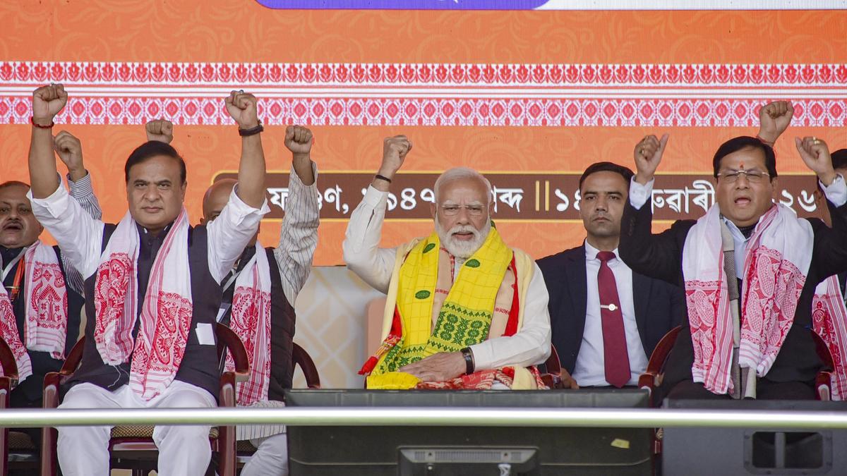 Prime Minister Narendra Modi, Union Minister Sarbananda Sonowal, Assam Chief Minister Himanta Biswa Sarma and others during a BJP workers’ meeting, in Guwahati, on Saturday, February 14, 2026.