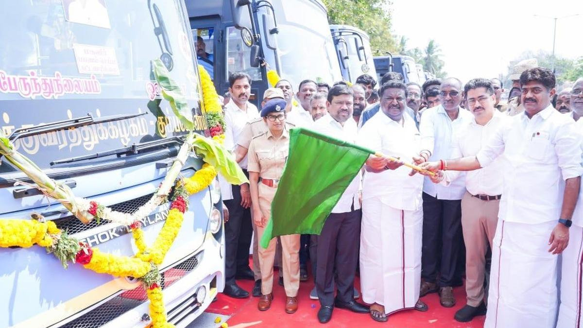 Transport Minister S.S. Sivasankar flags off the new CNG buses in Rameswaram on Wednsday.