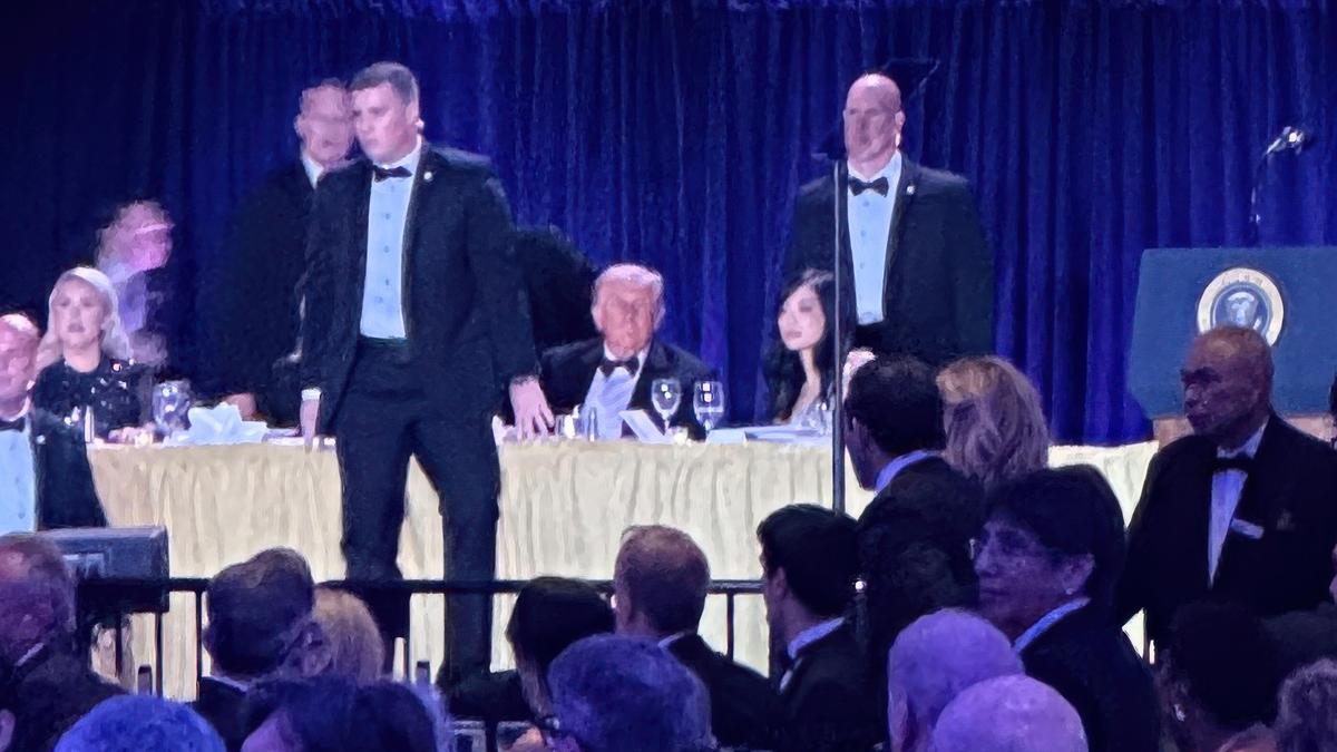 U.S. Secret Service agents surround U.S. President Donald Trump after a shooting incident outside the ballroom during the White House Correspondents Dinner, Saturday, April 25, 2026, in Washington.