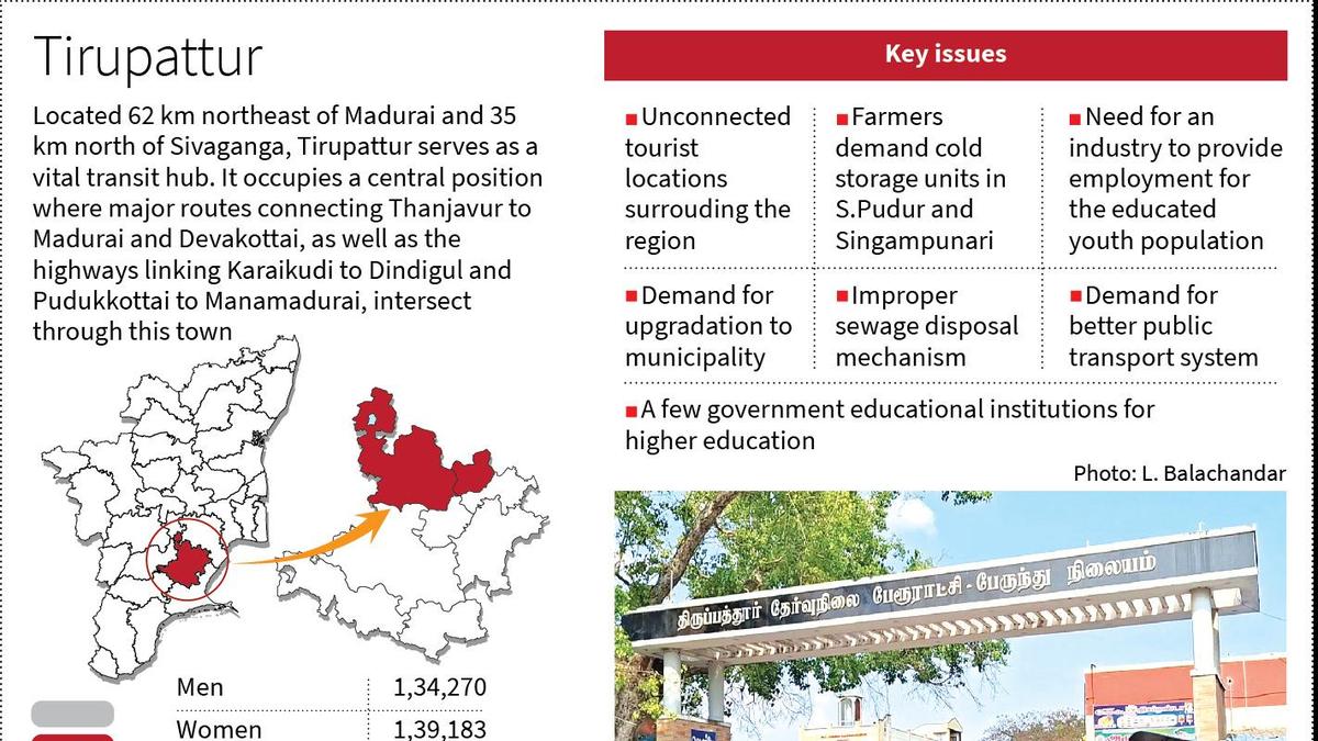 The Tirupattur constituency in Sivaganga district, which has had a DMK legislator since 2006 – for four consecutive terms – has not seen much progress under the current leadership. K.R. Periyakaruppan, incumbent MLA and Minister of Cooperation in the State, though has received a considerable support from the party and from the voters – partly due to his community background – has not received much of an appreciation for his performance in addressing local infrastructure issues and the persistent industrial backwardness of the constituency. Saravanan, a local auto driver, noted that because none of the major drinking water schemes implemented in other regions have reached the constituency, residents are forced to purchase water from private vendors at the rate of ₹25 per pot. “Despite the public’s evident frustration with an MLA who has not delivered any tangible benefits to the area, his personable nature and rapport with the locals ensure his victory in every election,” he noted. Peer Mohammad, another local resident, expressed his concern that the constituency’s reliance on neighbouring districts and constituencies for everything from quality education to basic medical care is only intensifying. Despite comprising five unions – Tirupattur, Singampunari, S. Pudur, Sakkottai and Kallal – five town panchayats –Tirupattur, Singampunari, Nerkuppai, Pallathur and Kanadukathan – and 2,76,156 voters – 1,35,113 men, 1,41,039 women and four others – the region remains an underdeveloped and economically isolated area. Lack of direct bus services “Even regarding basic facilities like public transportation, we are entirely dependent on buses passing through from Pudukkottai, Karaikudi, and Devakottai to reach Madurai and return. There are still no direct services from the Tirupattur bus stand to these major hubs. Consequently, traveling after 9:00 PM remains an exhausting ordeal even today,” Mr. Mohammad claimed. For education too, except for one government-aided college, they did not have any other educational institutions. He added that the region surrounded by rich tourist attractions like Pillayarpatti, Kundrakudi, Pranmalai, Singampunari, Kottampatti, Palani and Dindigul, could be further developed in this aspect if train tracks along with a station could be provided to the town. “The 70-year-old demand of the residents if fulfilled can be a better connecting point for tourists visiting the famous tourist attractions nearby. Also, it will be helpful for the farmers to easily transport their produce to the nearby famous Oddanchatiram market,” he noted. In agricultural hubs like Singampunari and S. Pudur, farmers remain heavily dependent on the Oddanchatiram market to sell their fruits and vegetables. Local growers argued that a cold storage facility is long overdue. Gnanasekaran, a local farmer, explained, “Without a way to preserve our harvest, we are forced to accept whatever price traders dictate for our perishable goods. A cold storage unit would enable us to hold our stock and wait for a fair market price.” A local graduate working at a tea shop expressed his frustration at being forced to stay in the town to care for his ailing parents. “The lack of local jobs or industrial units has left me with no choice but to take up menial labour to survive.” This was another major grievance among the younger electorate. Despite the Minister’s long tenure, the absence of a SIPCOT industrial park or any meaningful private investment has forced qualified graduates into the unorganised sector. The resentment carried by the voters in Tiruppattur has become a significant hurdle for Mr. Periyakaruppan as he is to officially begin his campaign for the Assembly elections. Having been re-nominated by the DMK just days ago, it is to be seen whether the veteran Minister would find himself at a crossroads where his long-standing political dominance would be tested by a modernised and more demanding electorate. Published – March 31, 2026 10:28 pm IST Share this: Click to share on WhatsApp (Opens in new window) WhatsApp Click to share on Facebook (Opens in new window) Facebook Click to share on Threads (Opens in new window) Threads Click to share on X (Opens in new window) X Click to share on Telegram (Opens in new window) Telegram Click to share on LinkedIn (Opens in new window) LinkedIn Click to share on Pinterest (Opens in new window) Pinterest Click to email a link to a friend (Opens in new window) Email More Click to print (Opens in new window) Print Click to share on Reddit (Opens in new window) Reddit Click to share on Tumblr (Opens in new window) Tumblr Click to share on Pocket (Opens in new window) Pocket Click to share on Mastodon (Opens in new window) Mastodon Click to share on Nextdoor (Opens in new window) Nextdoor Click to share on Bluesky (Opens in new window) Bluesky Like this:Like Loading... Post navigation Vijayawada police to divert heavy vehicles through West bypass to ease traffic congestion Mexxiss Technologies Postpones Dubai Launch of Global Digital Platforms Amid Rising Geopolitical Uncertainty