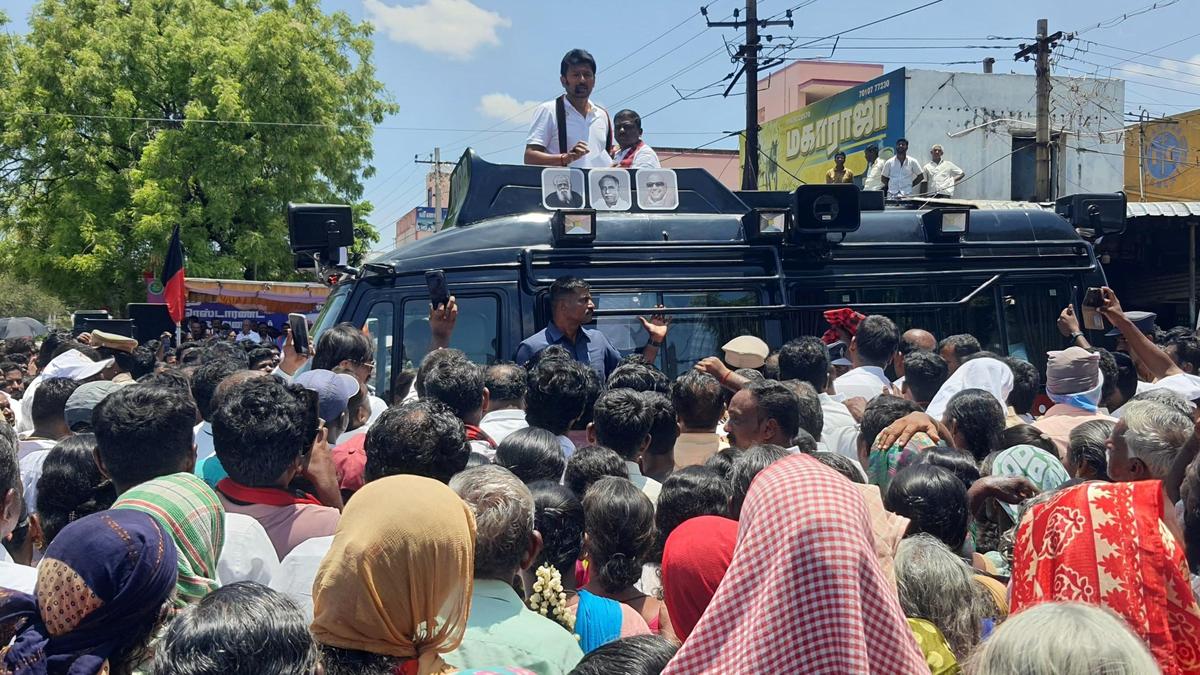 Deputy Chief Minister Udhayanidhi Stalin addressing a election campaign meeting at Kovilpatti on Wednesday. | Photo Credit: SPECIAL ARRANGEMENT Deputy Chief Minister Udhayanidhi Stalin on Wednesday said that Thoothukudi district stands as an example of secularism, while addressing an election rally in Kovilpatti, in support of DMK candidate K. Karunanidhi. He said that Thoothukudi district has consistently proven to be a stronghold of DMK. With progress in industries, port development, fisheries and agriculture, Thoothukudi has emerged as a model district. “It also stands as an example for secularism,” he noted. Published – April 15, 2026 09:24 pm IST Share this: Click to share on WhatsApp (Opens in new window) WhatsApp Click to share on Facebook (Opens in new window) Facebook Click to share on Threads (Opens in new window) Threads Click to share on X (Opens in new window) X Click to share on Telegram (Opens in new window) Telegram Click to share on LinkedIn (Opens in new window) LinkedIn Click to share on Pinterest (Opens in new window) Pinterest Click to email a link to a friend (Opens in new window) Email More Click to print (Opens in new window) Print Click to share on Reddit (Opens in new window) Reddit Click to share on Tumblr (Opens in new window) Tumblr Click to share on Pocket (Opens in new window) Pocket Click to share on Mastodon (Opens in new window) Mastodon Click to share on Nextdoor (Opens in new window) Nextdoor Click to share on Bluesky (Opens in new window) Bluesky Like this:Like Loading... Post navigation Postal voting for officials on poll duty begins in Madurai district SPCA urges crackdown on underage driving during summer holidays