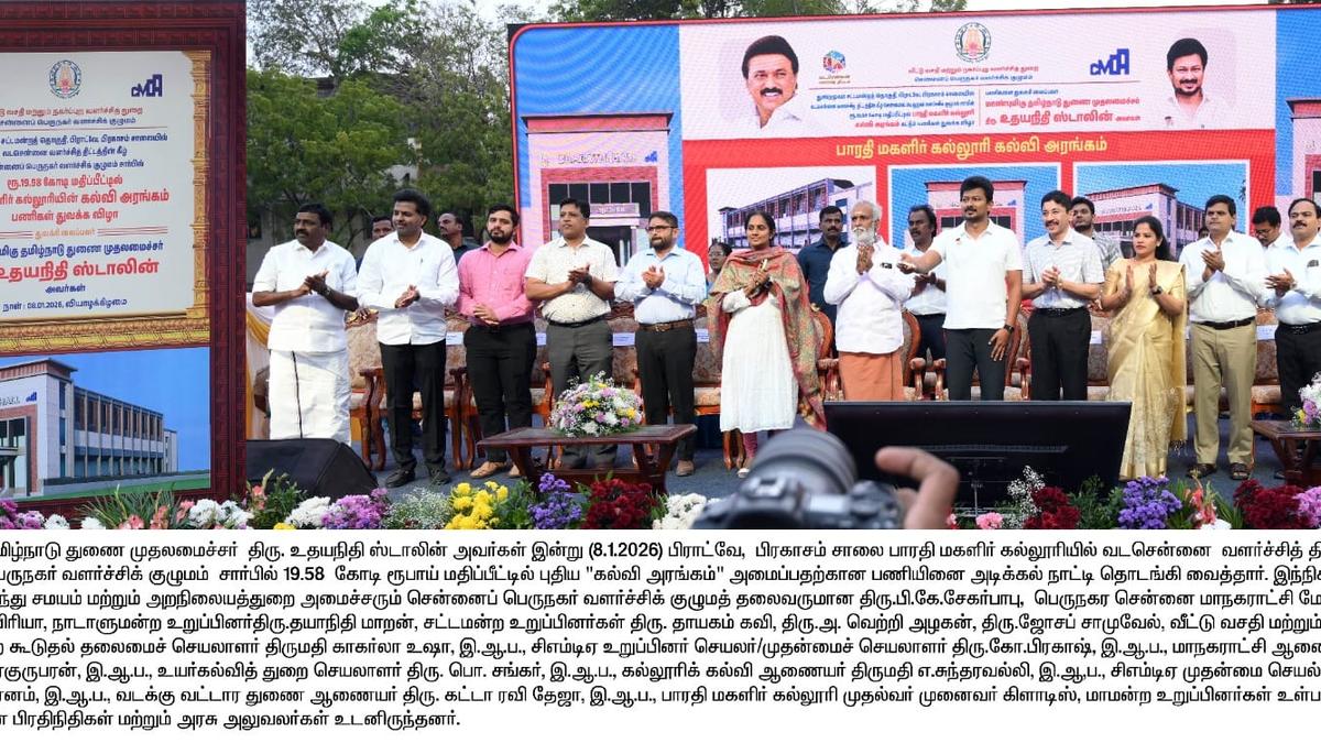 Deputy Chief Minister Udhayanidhi Stalin on Thursday laid the foundation for the construction of an auditorium at the Bharathi Women’s College in Broadway. The auditorium will be constructed by the Chennai Metropolitan Development Authority at a cost of ₹19.58 crore under the Vada Chennai Valarchi Thittam. Mr. Udhayanidhi also distributed 20 laptops to students under the State government initiative to distribute free laptops to college students. In his speech, the Deputy Chief Minister listed the various initiatives taken by the State government for the welfare of students and women, including Pudhumai Penn and Naan Mudhalvan. Mr. Udhayanidhi also urged students to utilise the free laptops for upskilling. Minister for Hindu Religious and Charitable Endowments P.K. Sekarbabu and Greater Chennai Corporation Mayor R. Priya were among those present. Published – January 09, 2026 12:30 am IST Share this: Click to share on WhatsApp (Opens in new window) WhatsApp Click to share on Facebook (Opens in new window) Facebook Click to share on Threads (Opens in new window) Threads Click to share on X (Opens in new window) X Click to share on Telegram (Opens in new window) Telegram Click to share on LinkedIn (Opens in new window) LinkedIn Click to share on Pinterest (Opens in new window) Pinterest Click to email a link to a friend (Opens in new window) Email More Click to print (Opens in new window) Print Click to share on Reddit (Opens in new window) Reddit Click to share on Tumblr (Opens in new window) Tumblr Click to share on Pocket (Opens in new window) Pocket Click to share on Mastodon (Opens in new window) Mastodon Click to share on Nextdoor (Opens in new window) Nextdoor Click to share on Bluesky (Opens in new window) Bluesky Like this:Like Loading... Post navigation Global economy shows signs of steady but subdued growth UN’s ‘responsibility to deliver’ will not waver, after US announces withdrawal from dozens of international organizations