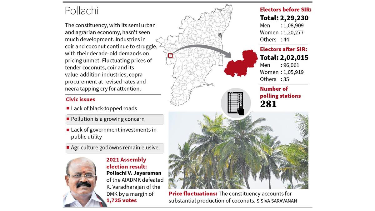 In the fray are four contenders: sitting MLA Pollachi V. Jayaraman of the AIADMK, K. Nithyanandan of the Kongunadu Makkal Desiya Katchi (KMDK), N. Senthilkumar of the Naam Tamilar Katchi (NTK) and G. Ramanathan of Tamilaga Vettri Kazhagam (TVK).