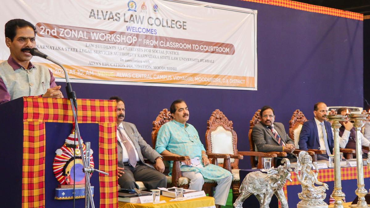 Karnataka High Court Judge H.P. Sandesh speaking at a workshop in Alva’s College, Moodbidri, on Monday. | Photo Credit: Special Arrangement Karnataka High Court Judge H.P. Sandesh said on Monday that upholding justice, equality, and human values is the fundamental duty of every citizen. The legal profession offers immense opportunities to realise this responsibility. He was speaking after inaugurating the second zonal level workshop: ‘From Classroom to Courtroom: Law Students as Catalyst for Social Justice’, at Alva’s College in Moodbidri. Karnataka State Legal Services Authority, Karnataka State Law University, Hubballi, and Alva’s Education Foundation jointly organised the workshop. Published – April 13, 2026 08:10 pm IST Share this: Click to share on WhatsApp (Opens in new window) WhatsApp Click to share on Facebook (Opens in new window) Facebook Click to share on Threads (Opens in new window) Threads Click to share on X (Opens in new window) X Click to share on Telegram (Opens in new window) Telegram Click to share on LinkedIn (Opens in new window) LinkedIn Click to share on Pinterest (Opens in new window) Pinterest Click to email a link to a friend (Opens in new window) Email More Click to print (Opens in new window) Print Click to share on Reddit (Opens in new window) Reddit Click to share on Tumblr (Opens in new window) Tumblr Click to share on Pocket (Opens in new window) Pocket Click to share on Mastodon (Opens in new window) Mastodon Click to share on Nextdoor (Opens in new window) Nextdoor Click to share on Bluesky (Opens in new window) Bluesky Like this:Like Loading... Post navigation Andhra University marks Ambedkar’s 135th birth anniversary Tamil Nadu Assembly election: Collector inspects distribution of booth slips to voters in Cuddalore