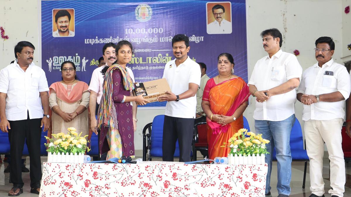 Deputy Chief Minister Udhayanidhi Stalin distributing laptops to students of Quaid-E-Millath Government College for Women on Anna Salai in Chennai under the ‘Ulagam Ungal Kaiyil’ scheme. | Photo Credit: Special Arrangement Tamil Nadu Deputy Chief Minister Udhayanidhi Stalin on Tuesday appealed to students to utilise the laptops distributed free of cost by the State government for educational purposes and not to watch YouTube and movies. Addressing students in Quaid-e-Millath Government College for Women on Anna Salai in Chennai, he said that students should make use of the opportunities provided to them. He further said that he hoped the laptops provided to them would also help in developing the State. Recalling the various measures undertaken by the State government towards higher education in the State, Mr. Udhayanidhi Stalin said that the Chief Minister has directed officials to distribute 10 lakh laptops to final-year students. Pointing out that the erstwhile AIADMK regime distributed laptops even to school students but had discontinued the programme in 2019, the Deputy CM said when it was intended to resume again, it was decided that laptops should be given to college students to help them pursue higher studies or in their employment. Chennai Central MP Dayanidhi Maran and senior officials were also present on the occasion. Published – January 13, 2026 08:04 pm IST Share this: Click to share on WhatsApp (Opens in new window) WhatsApp Click to share on Facebook (Opens in new window) Facebook Click to share on Threads (Opens in new window) Threads Click to share on X (Opens in new window) X Click to share on Telegram (Opens in new window) Telegram Click to share on LinkedIn (Opens in new window) LinkedIn Click to share on Pinterest (Opens in new window) Pinterest Click to email a link to a friend (Opens in new window) Email More Click to print (Opens in new window) Print Click to share on Reddit (Opens in new window) Reddit Click to share on Tumblr (Opens in new window) Tumblr Click to share on Pocket (Opens in new window) Pocket Click to share on Mastodon (Opens in new window) Mastodon Click to share on Nextdoor (Opens in new window) Nextdoor Click to share on Bluesky (Opens in new window) Bluesky Like this:Like Loading... Post navigation SMA patients in Kerala seek budgetary support for free drug scheme Special trains for Makaravilakku pilgrims