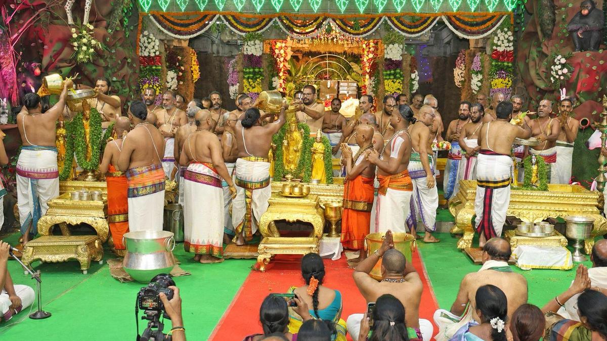 Priests performing ‘Snapana Thirumanjanam’ to the deities on the final day of the annual Vasanthotsavams in Tirumala on Wednesday. The annual three-day Vasanthotsavams concluded on a grand note on Wednesday at the temple of Lord Venkateswara in Tirumala. ‘Snapana Tirumanjanam’ was rendered to the processional deities of Lord Malayappa Swamy, Goddess Sridevi and Goddess Bhudevi, Lord Kodandarama and Goddess Sita Devi, Lakshmana Swamy, Lord Anjaneya Swamy, and Goddess Rukmini and Lord Sri Krishna ceremoniously amid the recitation of hymns by Veda Parayanamdars. The Vasanthotsavam is an annual event performed in Tirumala on the auspicious days of Trayodasi, Chaturdasi and Pournami in the month of Chaitra (March/April) every year to mark the onset of spring season. The utsava deities of Lord Malayappa and His consorts were given aromatic bath on these three days, believed to give a soothing relief to the deities from the scorching Sun. On the last days, the deities of three aeons, Treta, Dwapara and Kaliyuga were rendered aromatic bath. The temple’s Pedda Jeeyar, along with his deputy Chinna Jeeyar, Peishkar Rama Krishna and other officials took part in the festival. Published – April 01, 2026 08:10 pm IST Share this: Click to share on WhatsApp (Opens in new window) WhatsApp Click to share on Facebook (Opens in new window) Facebook Click to share on Threads (Opens in new window) Threads Click to share on X (Opens in new window) X Click to share on Telegram (Opens in new window) Telegram Click to share on LinkedIn (Opens in new window) LinkedIn Click to share on Pinterest (Opens in new window) Pinterest Click to email a link to a friend (Opens in new window) Email More Click to print (Opens in new window) Print Click to share on Reddit (Opens in new window) Reddit Click to share on Tumblr (Opens in new window) Tumblr Click to share on Pocket (Opens in new window) Pocket Click to share on Mastodon (Opens in new window) Mastodon Click to share on Nextdoor (Opens in new window) Nextdoor Click to share on Bluesky (Opens in new window) Bluesky Like this:Like Loading... Post navigation Congress planning law to appease religious minorities in Assam: PM Speaker urges public cooperation for completing Census 2027