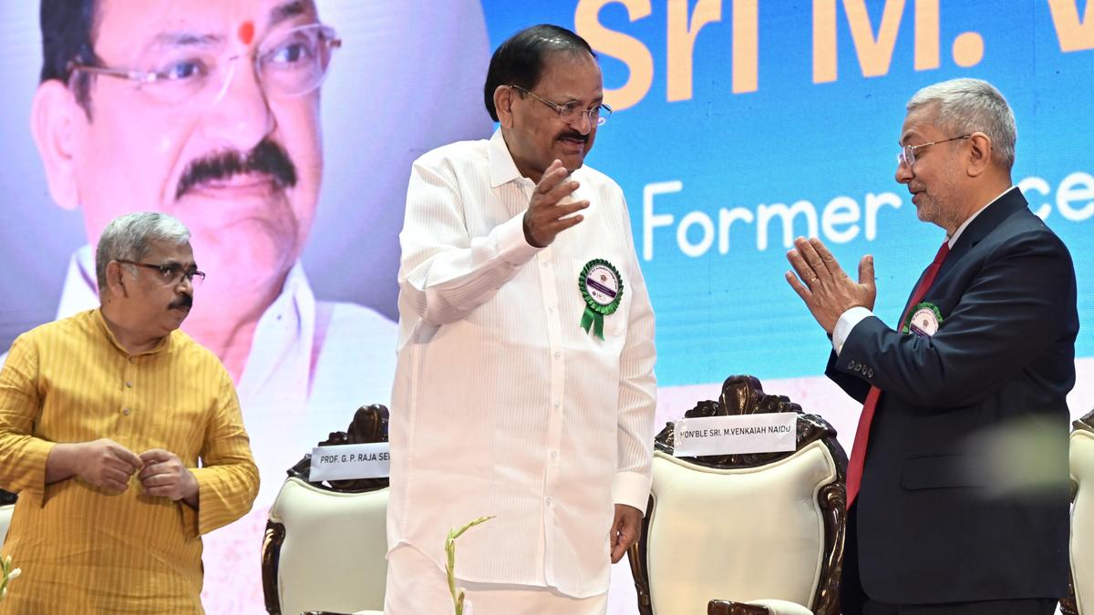 Former Vice President M. Venkaiah Naidu in conversation with retired Supreme Court Justice Kurian Joseph at the centenary celebrations of Dr. B.R. Ambedkar College of Law, Andhra University, in Visakhapatnam on Thursday. AU Vice-Chancellor Prof. G.P. Raja Sekhar looks on.